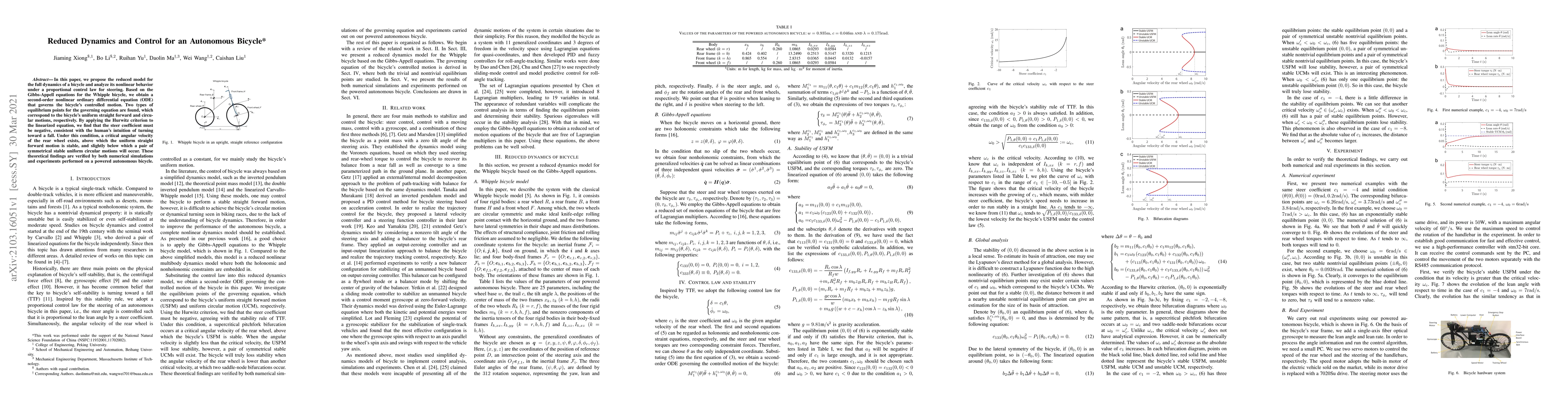 This paper develops a reduced model for the dynamics of an autonomous bicycle, deriving a second-order nonlinear ODE that governs its controlled motion. It identifies equilibrium points for straight and circular motions and confirms stability conditions through the Hurwitz criterion, validated by simulations and experiments.