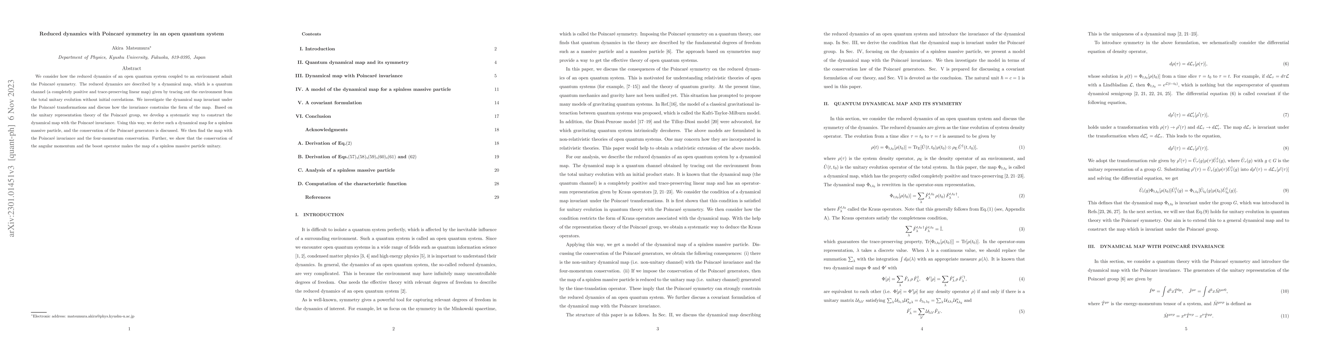 This paper explores the reduced dynamics of open quantum systems that maintain Poincaré symmetry. It develops a method to derive dynamical maps invariant under the Poincaré group, exemplified by the dynamics of massive and massless particles, and demonstrates the conservation of Poincaré generators and four-momentum.