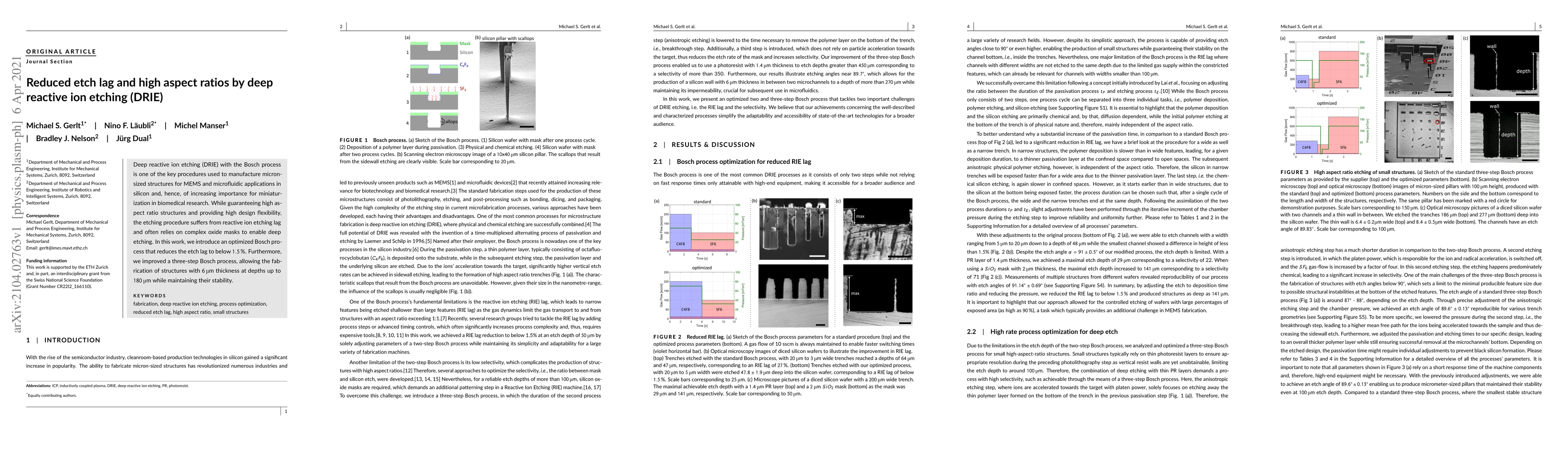 This research optimizes the Bosch process in deep reactive ion etching (DRIE) to minimize etch lag to under 1.5% and enhance the fabrication of high aspect ratio structures, enabling stable micron-sized structures in silicon for MEMS and microfluidic applications.