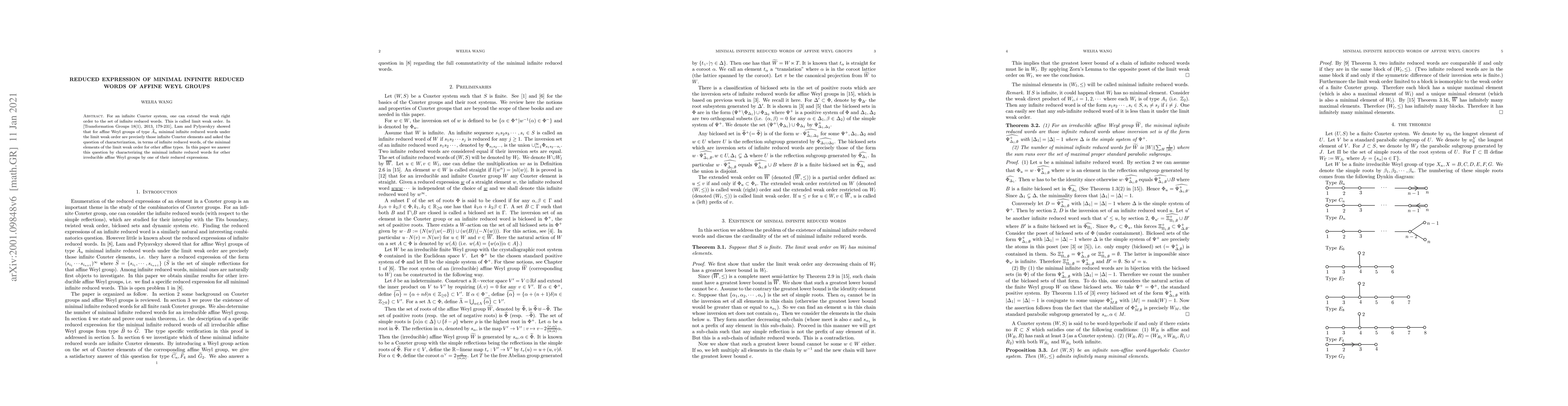 For an infinite Coxeter system, one can extend the weak right order to the set of infinite reduced words. This is called limit weak order. In [Transformation Groups 18(1), 2013, 179-231], Lam and Pylyavskyy showed that for affine Weyl groups of type $\widetilde{A}_n$ minimal infinite reduced words under the limit weak order are precisely those infinite Coxeter elements and asked the question of characterization, in terms of infinite reduced words, of the minimal elements of the limit weak order for other affine types. In this paper, we answer this question by characterizing the minimal infinite reduced words for other irreducible affine Weyl groups by one of their reduced expressions.