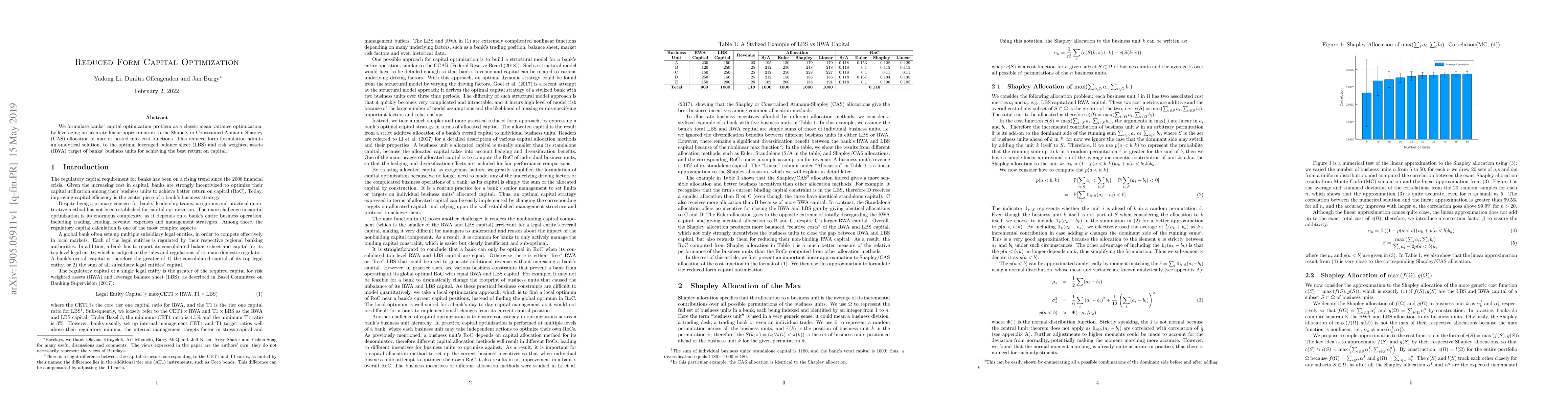 We formulate banks' capital optimization problem as a classic mean variance optimization, by leveraging an accurate linear approximation to the Shapely or Constrained Aumann-Shapley (CAS) allocation of max or nested max cost functions. This reduced form formulation admits an analytical solution, to the optimal leveraged balance sheet (LBS) and risk weighted assets (RWA) target of banks' business units for achieving the best return on capital.
