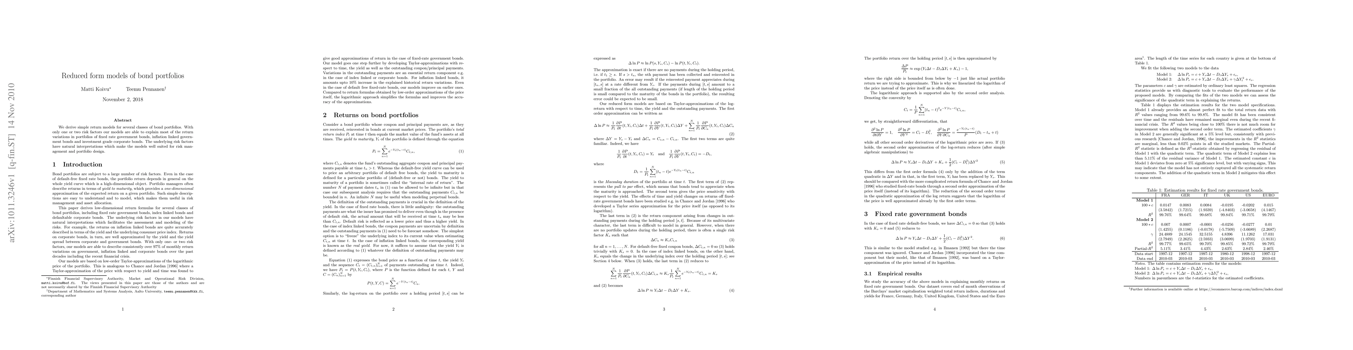 We derive simple return models for several classes of bond portfolios. With only one or two risk factors our models are able to explain most of the return variations in portfolios of fixed rate government bonds, inflation linked government bonds and investment grade corporate bonds. The underlying risk factors have natural interpretations which make the models well suited for risk management and portfolio design.