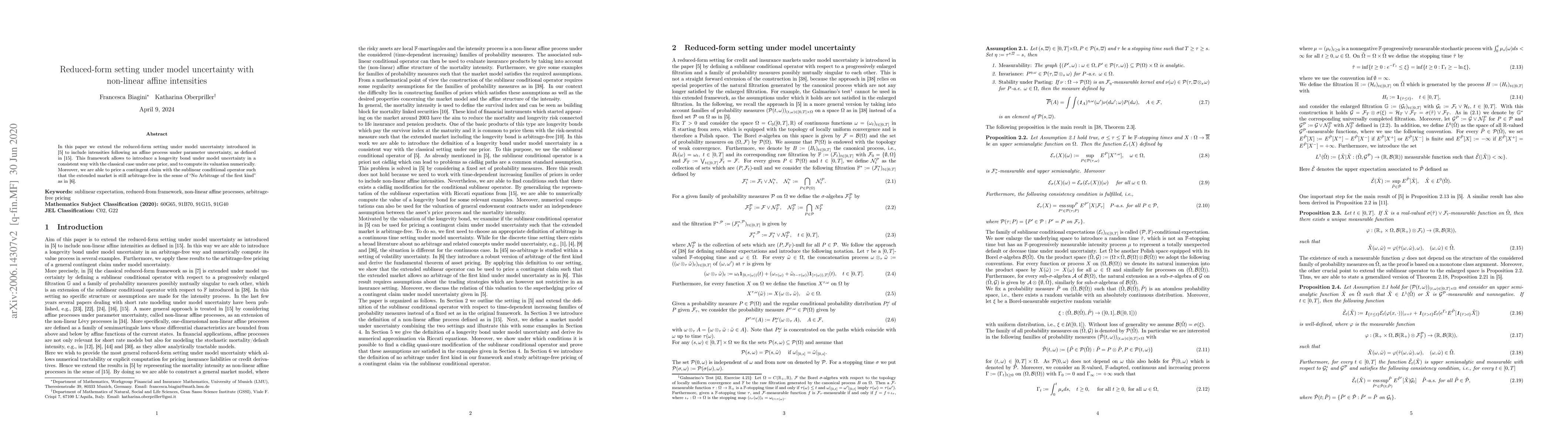 This paper extends the reduced-form setting under model uncertainty to include affine processes with parameter uncertainty, allowing for the valuation of longevity bonds and contingent claims while maintaining arbitrage-free conditions. The framework introduces a sublinear conditional operator for pricing.