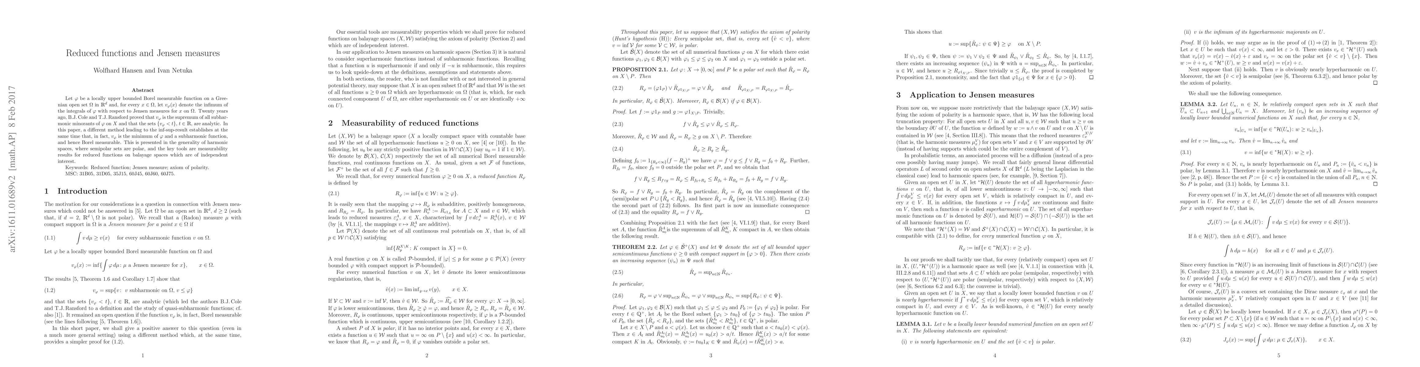 This paper explores the properties of locally upper bounded Borel measurable functions on Greenian open sets, establishing that the reduced function $v_\varphi$ is the minimum of $\varphi$ and a subharmonic function, thereby proving its Borel measurability. This result is achieved using a different method and extends to harmonic spaces where semipolar sets are polar, emphasizing measurability results for reduced functions.