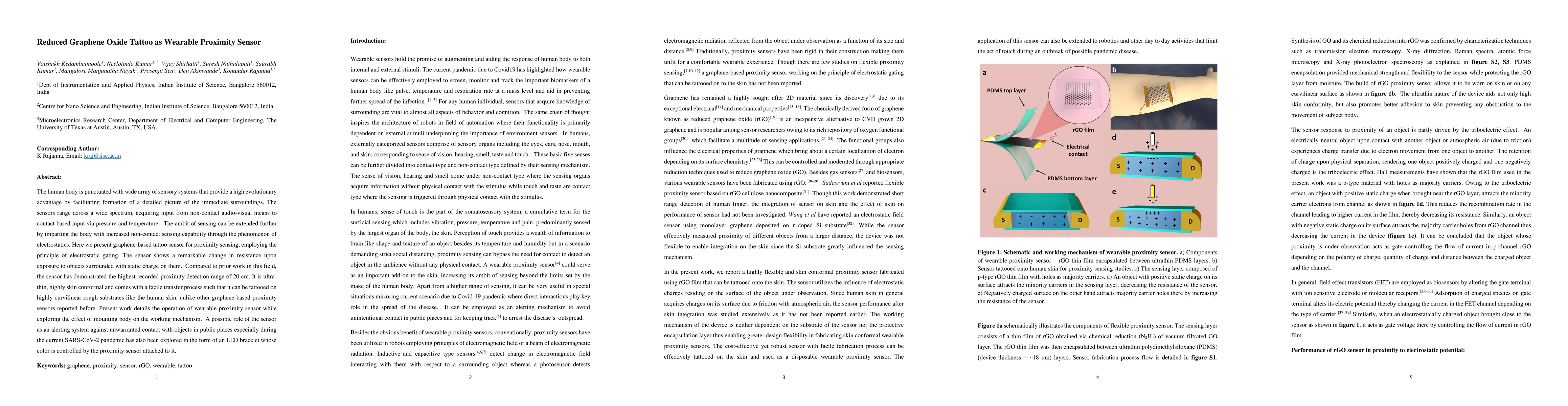 This research introduces a graphene oxide tattoo sensor for proximity detection, achieving a record 20 cm range. It's thin, skin-conformal, and easily transferable. The sensor could potentially serve as an alert system for unwanted contact, exemplified by an LED bracelet controlled by the tattoo sensor.