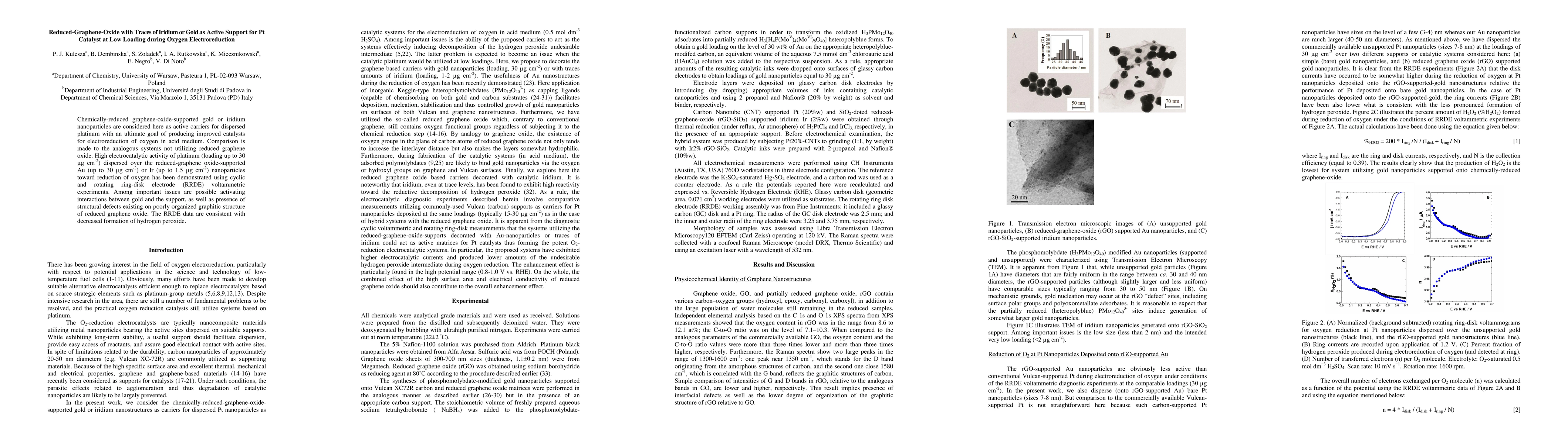 This paper investigates the enhanced electrocatalytic performance of platinum catalysts dispersed on reduced graphene oxide supports with trace amounts of gold or iridium for oxygen reduction in acidic conditions, demonstrating significant improvements in activity and reduced hydrogen peroxide formation compared to non-graphene-supported systems.