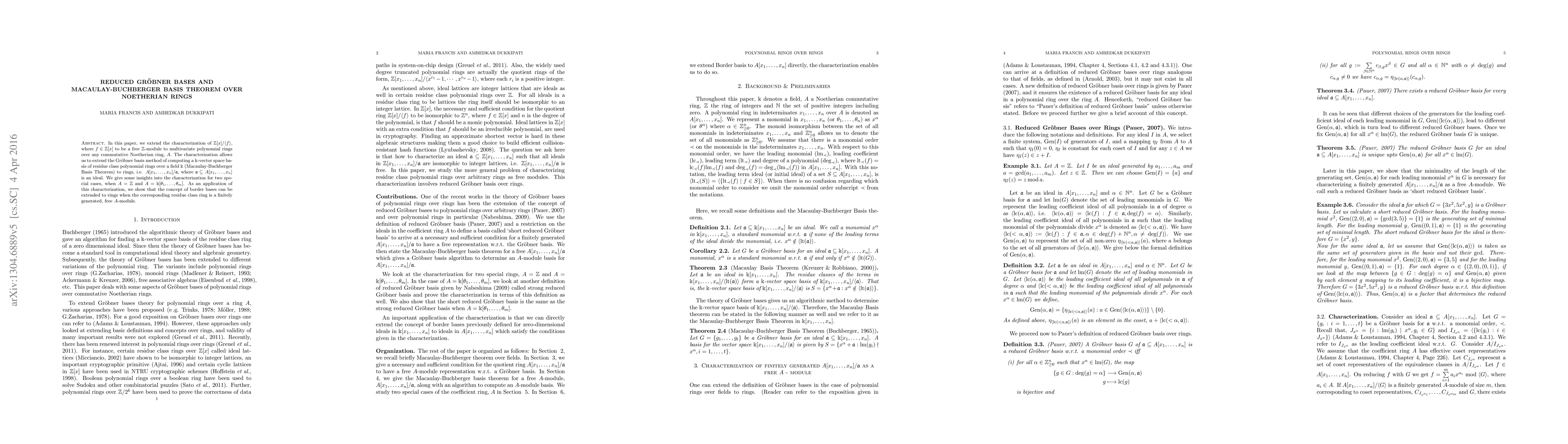 In this paper, we extend the characterization of $\mathbb{Z}[x]/\ < f \ >$, where $f \in \mathbb{Z}[x]$ to be a free $\mathbb{Z}$-module to multivariate polynomial rings over any commutative Noetherian ring, $A$. The characterization allows us to extend the Gr\"obner basis method of computing a $\Bbbk$-vector space basis of residue class polynomial rings over a field $\Bbbk$ (Macaulay-Buchberger Basis Theorem) to rings, i.e. $A[x_1,\ldots,x_n]/\mathfrak{a}$, where $\mathfrak{a} \subseteq A[x_1,\ldots,x_n]$ is an ideal. We give some insights into the characterization for two special cases, when $A = \mathbb{Z}$ and $A = \Bbbk[\theta_1,\ldots,\theta_m]$. As an application of this characterization, we show that the concept of border bases can be extended to rings when the corresponding residue class ring is a finitely generated, free $A$-module.