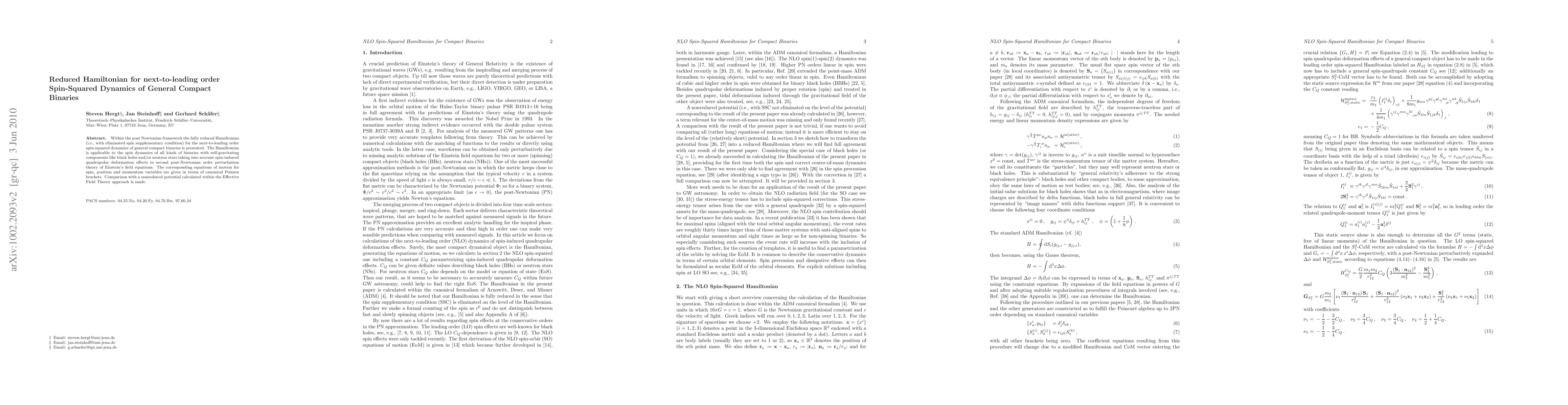 This paper presents a fully reduced Hamiltonian for the next-to-leading order spin-squared dynamics of general compact binaries within the post-Newtonian framework, applicable to binaries with self-gravitating components such as black holes and neutron stars. The study considers spin-induced quadrupolar deformation effects and provides equations of motion in canonical Poisson brackets, comparing results with the Effective Field Theory approach.