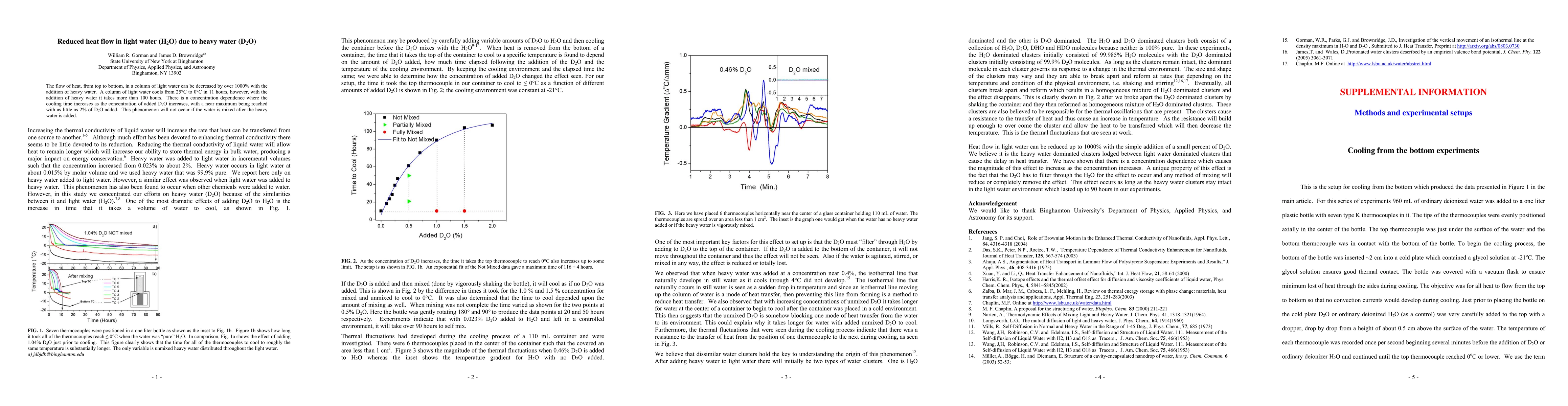 The flow of heat, from top to bottom, in a column of light water can be decreased by over 1000% with the addition of heavy water. A column of light water cools from 25 C to 0 C in 11 hours, however, with the addition of heavy water it takes more than 100 hours. There is a concentration dependence where the cooling time increases as the concentration of added (D2O) increases, with a near maximum being reached with as little as 2% of (D2O) added. This phenomenon will not occur if the water is mixed after the heavy water is added.