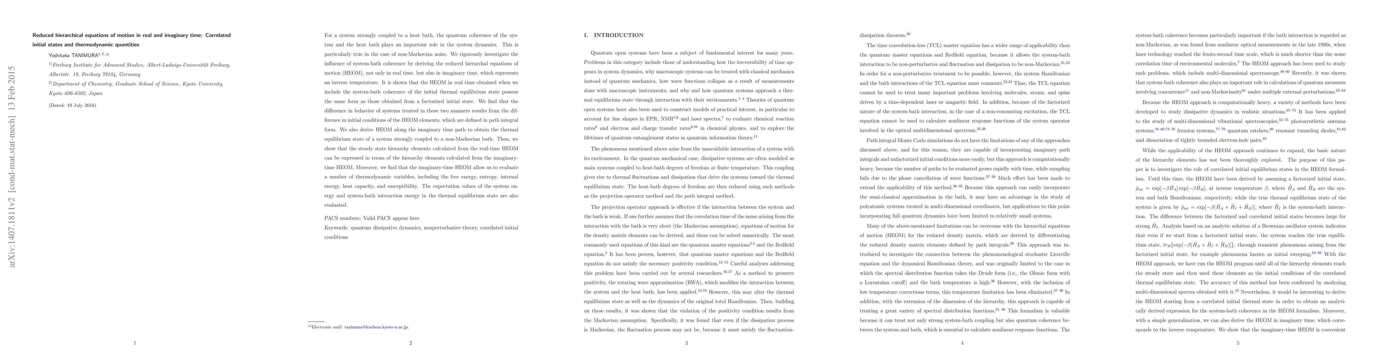 For a system strongly coupled to a heat bath, the quantum coherence of the system and the heat bath plays an important role in the system dynamics. This is particularly true in the case of non-Markovian noise. We rigorously investigate the influence of system-bath coherence by deriving the reduced hierarchal equations of motion (HEOM), not only in real time, but also in imaginary time, which represents an inverse temperature. It is shown that the HEOM in real time obtained when we include the system-bath coherence of the initial thermal equilibrium state possess the same form as those obtained from a factorized initial state. We find that the difference in behavior of systems treated in these two manners results from the difference in initial conditions of the HEOM elements, which are defined in path integral form. We also derive HEOM along the imaginary time path to obtain the thermal equilibrium state of a system strongly coupled to a non-Markovian bath. Then, we show that the steady state hierarchy elements calculated from the real-time HEOM can be expressed in terms of the hierarchy elements calculated from the imaginary-time HEOM. Moreover, we find that the imaginary-time HEOM allow us to evaluate a number of thermodynamic variables, including the free energy, entropy, internal energy, heat capacity, and susceptibility. The expectation values of the system energy and system-bath interaction energy in the thermal equilibrium state are also evaluated.