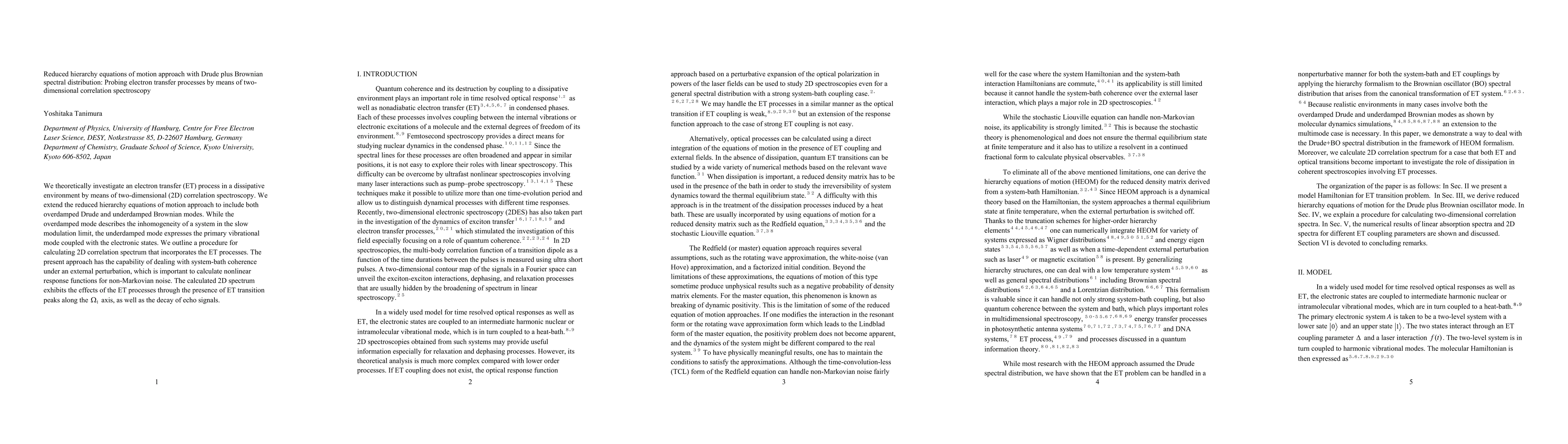 This research paper explores electron transfer processes in a dissipative environment using 2D correlation spectroscopy and extends the reduced hierarchy equations of motion approach to include Drude and Brownian modes, revealing ET transition peaks and decay of echo signals.