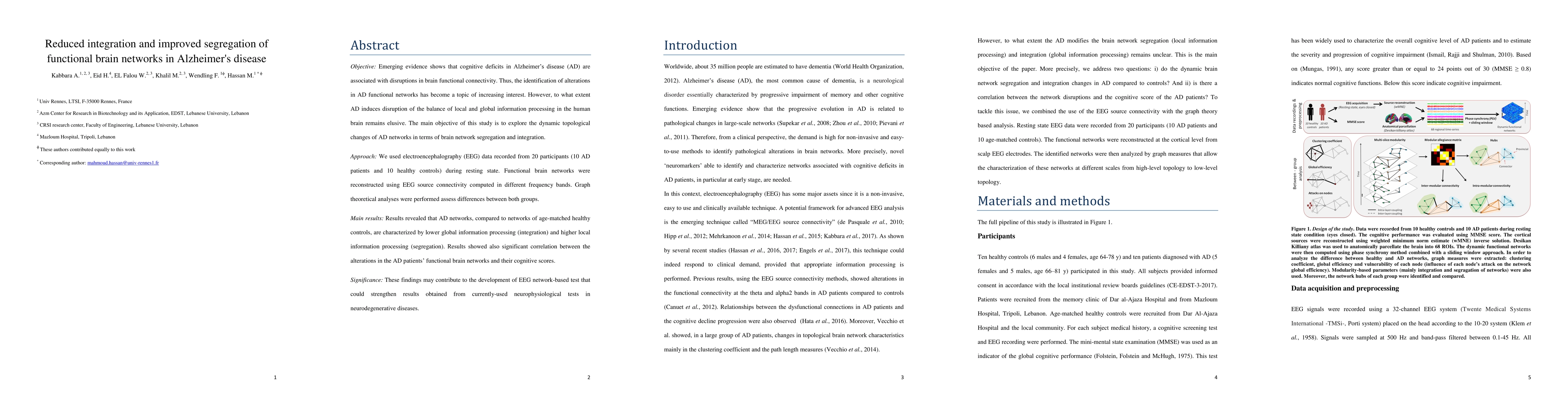 Emerging evidence shows that cognitive deficits in Alzheimer disease (AD) are associated with disruptions in brain functional connectivity. Thus, the identification of alterations in AD functional networks has become a topic of increasing interest. However, to what extent AD induces disruption of the balance of local and global information processing in the human brain remains elusive. The main objective of this study is to explore the dynamic topological changes of AD networks in terms of brain network segregation and integration. We used electroencephalography (EEG) data recorded from 20 participants (10 AD patients and 10 healthy controls) during resting state. Functional brain networks were reconstructed using EEG source connectivity computed in different frequency bands. Graph theoretical analyses were performed assess differences between both groups. Results revealed that AD networks, compared to networks of age matched healthy controls, are characterized by lower global information processing (integration) and higher local information processing (segregation). Results showed also significant correlation between the alterations in the AD patients functional brain networks and their cognitive scores. These findings may contribute to the development of EEG network-based test that could strengthen results obtained from currently used neurophysiological tests in neurodegenerative diseases.