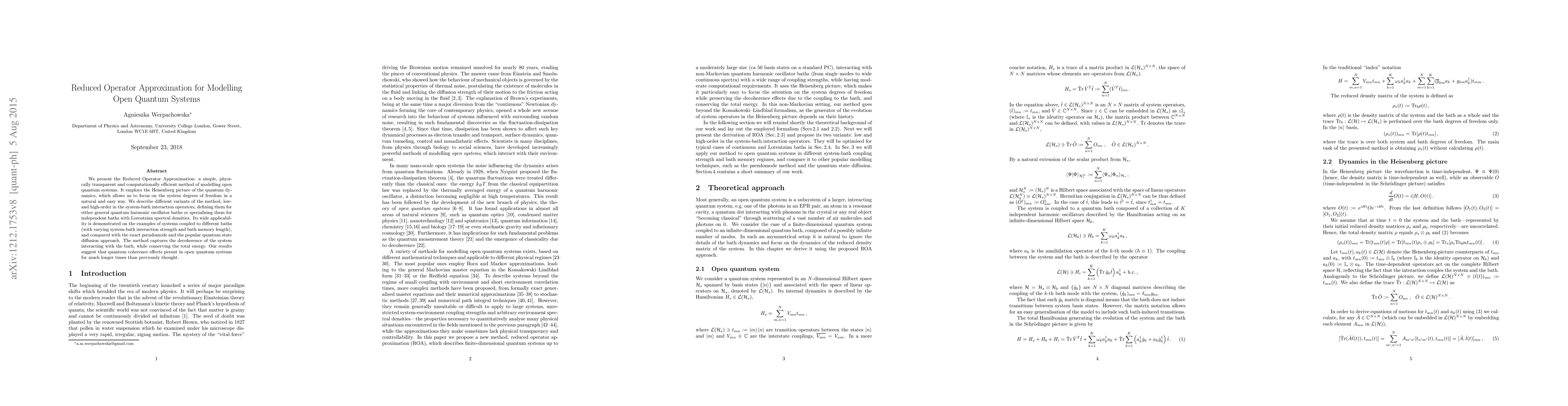 We present the Reduced Operator Approximation: a simple, physically transparent and computationally efficient method of modelling open quantum systems. It employs the Heisenberg picture of the quantum dynamics, which allows us to focus on the system degrees of freedom in a natural and easy way. We describe different variants of the method, low- and high-order in the system-bath interaction operators, defining them for either general quantum harmonic oscillator baths or specialising them for independent baths with Lorentzian spectral densities. Its wide applicability is demonstrated on the examples of systems coupled to different baths (with varying system-bath interaction strength and bath memory length), and compared with the exact pseudomode and the popular quantum state diffusion approach. The method captures the decoherence of the system interacting with the bath, while conserving the total energy. Our results suggest that quantum coherence effects persist in open quantum systems for much longer times than previously thought.