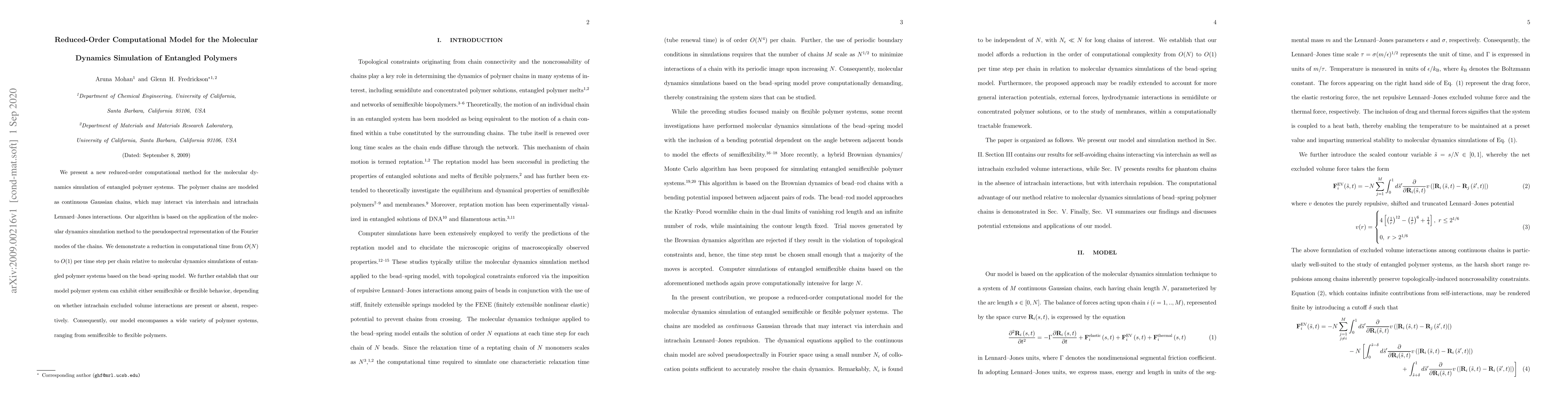 This paper introduces a reduced-order computational method for simulating entangled polymer dynamics using continuous Gaussian chain models and pseudospectral representation of Fourier modes in molecular dynamics simulations. The approach aims to enhance computational efficiency while maintaining accuracy.