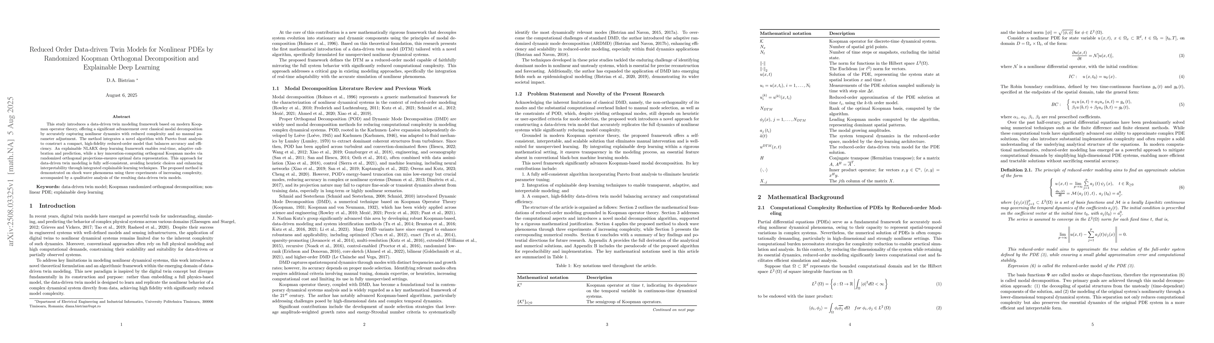 This study introduces a data-driven twin modeling framework based on modern Koopman operator theory, offering a significant advancement over classical modal decomposition by accurately capturing nonlinear dynamics with reduced complexity and no manual parameter adjustment. The method integrates a novel algorithm with Pareto front analysis to construct a compact, high-fidelity reduced-order model that balances accuracy and efficiency. An explainable NLARX deep learning framework enables real-time, adaptive calibration and prediction, while a key innovation-computing orthogonal Koopman modes via randomized orthogonal projections-ensures optimal data representation. This approach for data-driven twin modeling is fully self-consistent, avoiding heuristic choices and enhancing interpretability through integrated explainable learning techniques. The proposed method is demonstrated on shock wave phenomena using three experiments of increasing complexity, accompanied by a qualitative analysis of the resulting data-driven twin models.
