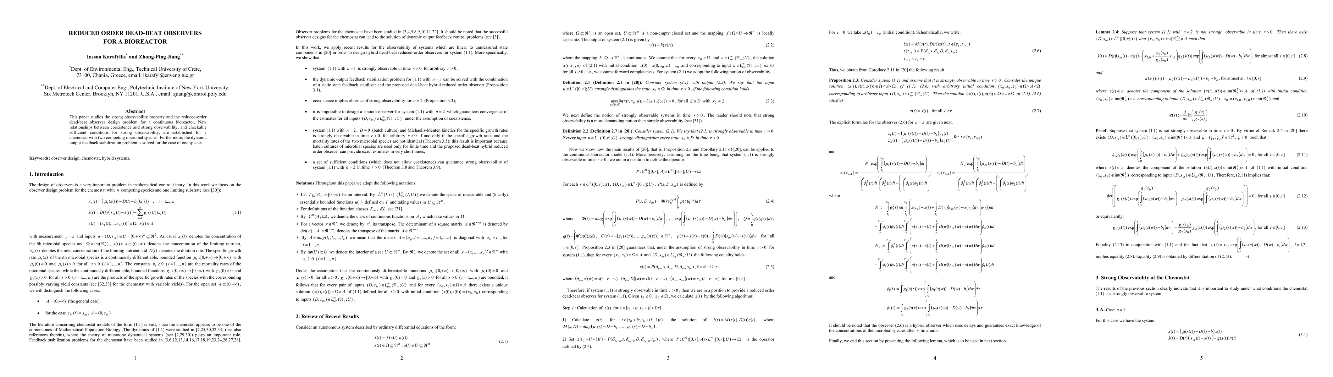 This paper investigates strong observability in a bioreactor and designs reduced-order dead-beat observers for a chemostat with two competing microbial species, establishing sufficient conditions for strong observability and solving dynamic output feedback stabilization for one species.