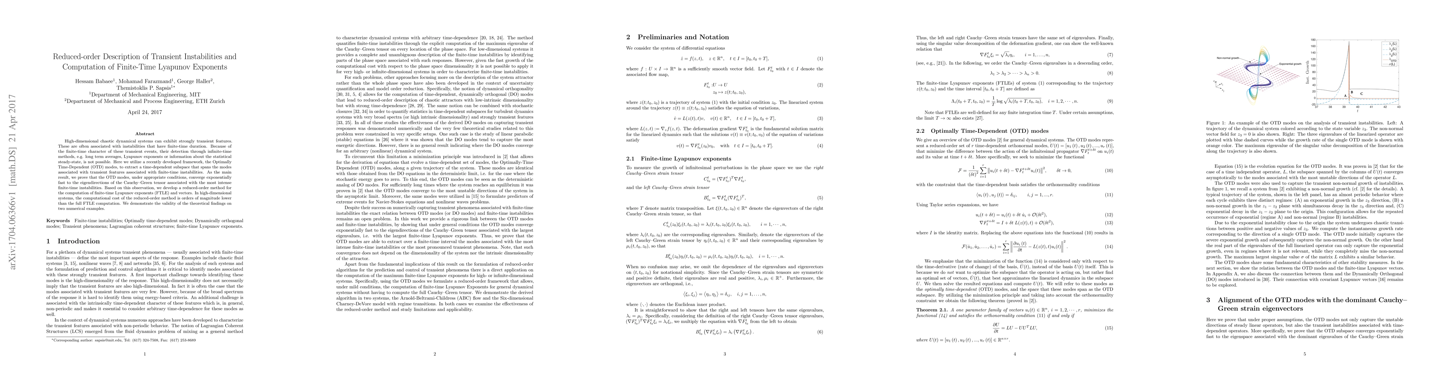 High-dimensional chaotic dynamical systems can exhibit strongly transient features. These are often associated with instabilities that have finite-time duration. Because of the finite-time character of these transient events, their detection through infinite-time methods, e.g. long term averages, Lyapunov exponents or information about the statistical steady-state, is not possible. Here we utilize a recently developed framework, the Optimally Time-Dependent (OTD) modes, to extract a time-dependent subspace that spans the modes associated with transient features associated with finite-time instabilities. As the main result, we prove that the OTD modes, under appropriate conditions, converge exponentially fast to the eigendirections of the Cauchy--Green tensor associated with the most intense finite-time instabilities. Based on this observation, we develop a reduced-order method for the computation of finite-time Lyapunov exponents (FTLE) and vectors. In high-dimensional systems, the computational cost of the reduced-order method is orders of magnitude lower than the full FTLE computation. We demonstrate the validity of the theoretical findings on two numerical examples.