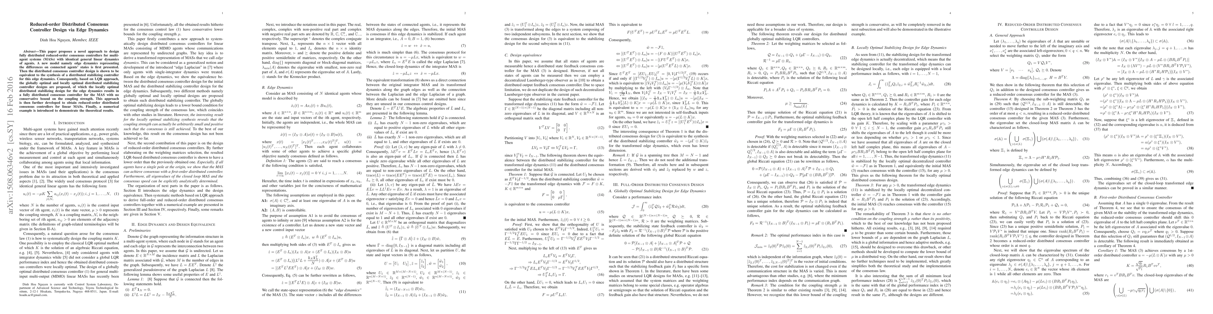 This paper proposes a novel approach to design reduced-order distributed consensus controllers for multi-agent systems (MASs) with identical linear dynamics of agents. A new model namely edge dynamics representing the differences on agents' states is first presented. Then the distributed consensus controller design is shown to be equivalent to the synthesis of a distributed stabilizing controller for this edge dynamics. Consequently, based on LQR approach, the globally optimal and locally optimal distributed stabilizing controller designs are proposed, of which the locally distributed stabilizing controller for the edge dynamics results in a distributed consensus controller for the MAS with no conservative bound on the coupling strength. This approach is next further developed to obtain reduced-order distributed consensus controllers for linear MASs. Several numerical examples are introduced to illustrate the theoretical results.