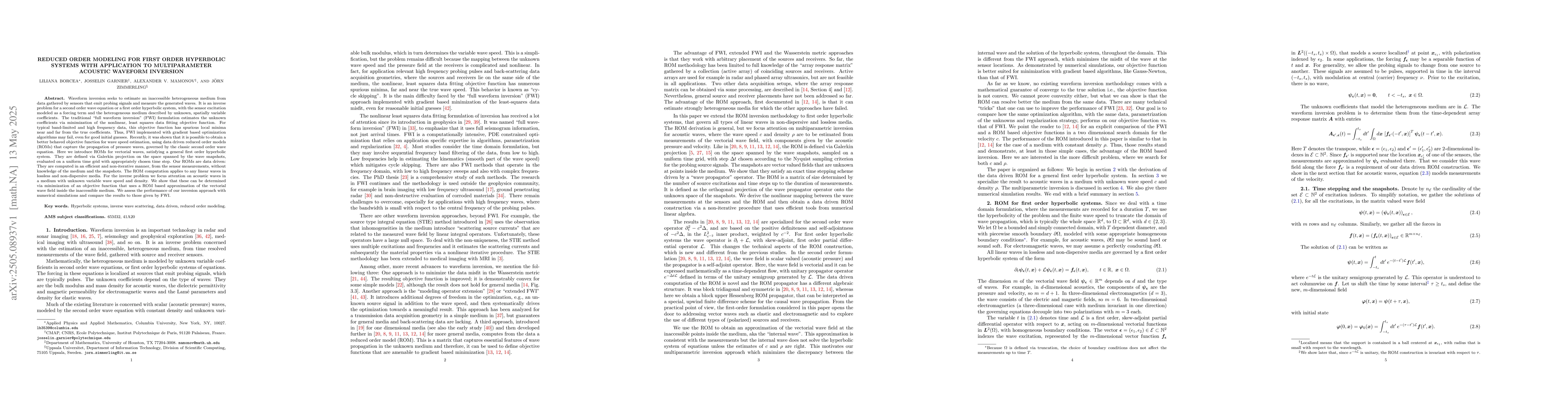 This work extends previous ROMs for second-order wave equations to first-order hyperbolic systems, enabling the application to a broader class of problems, specifically acoustic waveform inversion with unknown variable wave speed and density.