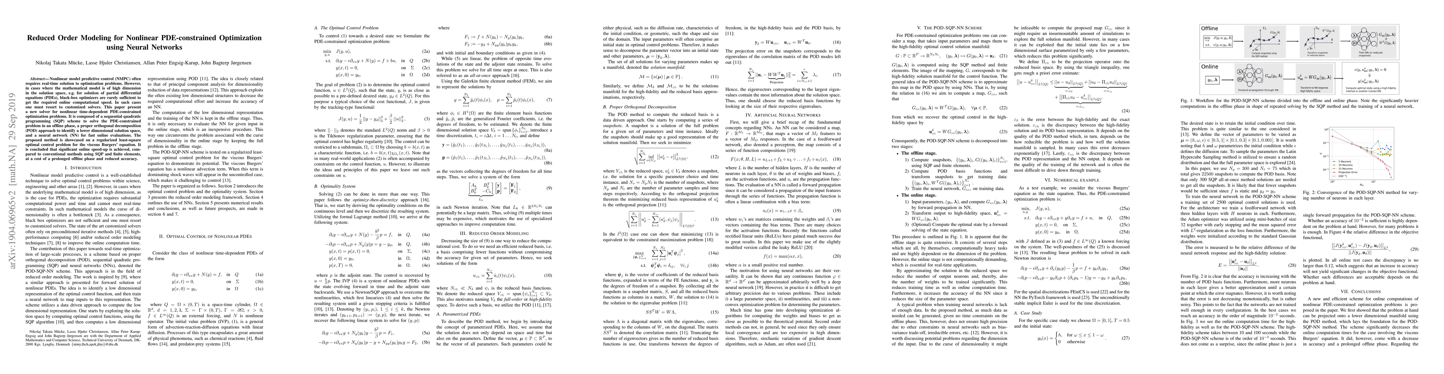 Nonlinear model predictive control (NMPC) often requires real-time solution to optimization problems. However, in cases where the mathematical model is of high dimension in the solution space, e.g. for solution of partial differential equations (PDEs), black-box optimizers are rarely sufficient to get the required online computational speed. In such cases one must resort to customized solvers. This paper present a new solver for nonlinear time-dependent PDE-constrained optimization problems. It is composed of a sequential quadratic programming (SQP) scheme to solve the PDE-constrained problem in an offline phase, a proper orthogonal decomposition (POD) approach to identify a lower dimensional solution space, and a neural network (NN) for fast online evaluations. The proposed method is showcased on a regularized least-square optimal control problem for the viscous Burgers' equation. It is concluded that significant online speed-up is achieved, compared to conventional methods using SQP and finite elements, at a cost of a prolonged offline phase and reduced accuracy.