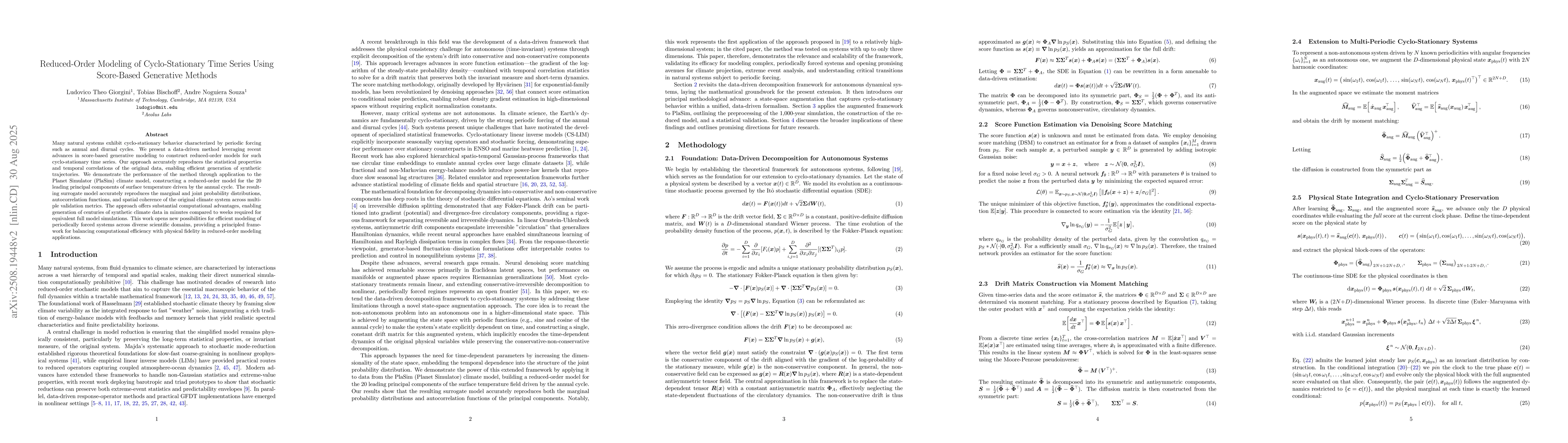 Many natural systems exhibit cyclo-stationary behavior characterized by periodic forcing such as annual and diurnal cycles. We present a data-driven method leveraging recent advances in score-based generative modeling to construct reduced-order models for such cyclo-stationary time series. Our approach accurately reproduces the statistical properties and temporal correlations of the original data, enabling efficient generation of synthetic trajectories. We demonstrate the performance of the method through application to the Planet Simulator (PlaSim) climate model, constructing a reduced-order model for the 20 leading principal components of surface temperature driven by the annual cycle. The resulting surrogate model accurately reproduces the marginal and joint probability distributions, autocorrelation functions, and spatial coherence of the original climate system across multiple validation metrics. The approach offers substantial computational advantages, enabling generation of centuries of synthetic climate data in minutes compared to weeks required for equivalent full model simulations. This work opens new possibilities for efficient modeling of periodically forced systems across diverse scientific domains, providing a principled framework for balancing computational efficiency with physical fidelity in reduced-order modeling applications.