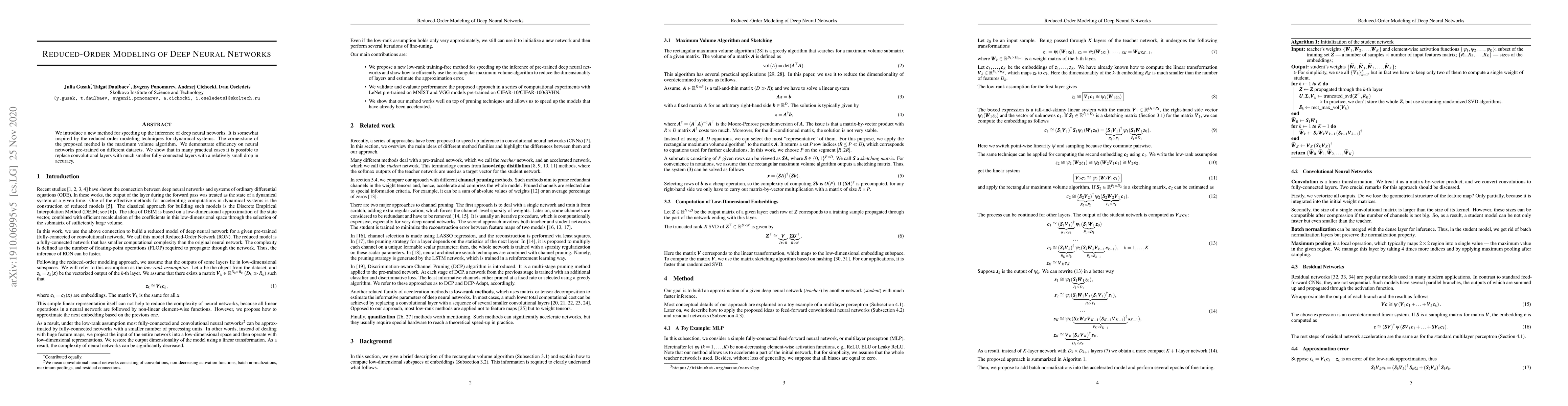 We introduce a new method for speeding up the inference of deep neural networks. It is somewhat inspired by the reduced-order modeling techniques for dynamical systems.The cornerstone of the proposed method is the maximum volume algorithm. We demonstrate efficiency on neural networks pre-trained on different datasets. We show that in many practical cases it is possible to replace convolutional layers with much smaller fully-connected layers with a relatively small drop in accuracy.