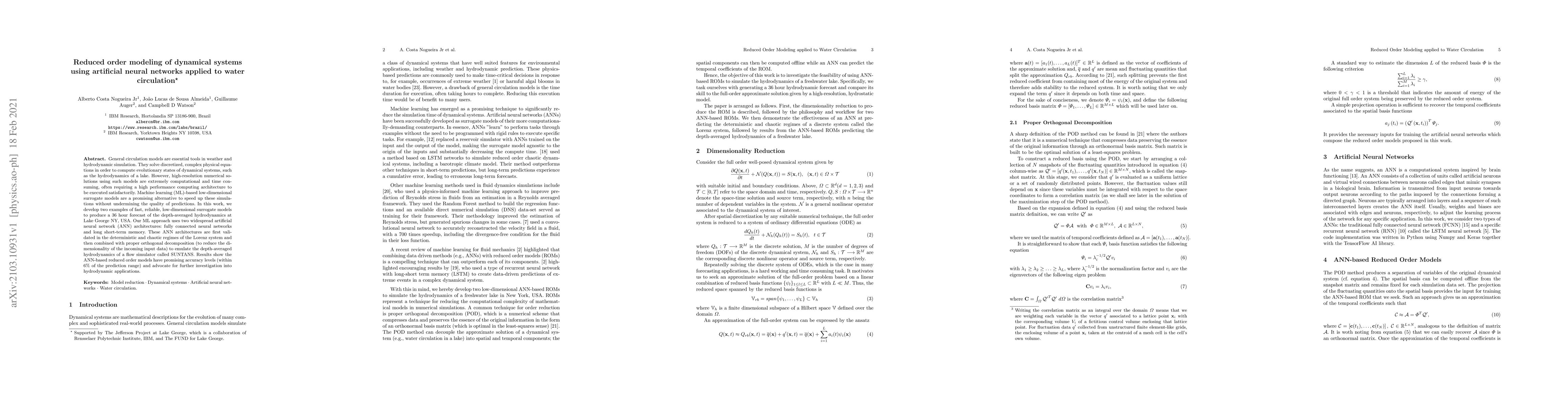 General circulation models are essential tools in weather and hydrodynamic simulation. They solve discretized, complex physical equations in order to compute evolutionary states of dynamical systems, such as the hydrodynamics of a lake. However, high-resolution numerical solutions using such models are extremely computational and time consuming, often requiring a high performance computing architecture to be executed satisfactorily. Machine learning (ML)-based low-dimensional surrogate models are a promising alternative to speed up these simulations without undermining the quality of predictions. In this work, we develop two examples of fast, reliable, low-dimensional surrogate models to produce a 36 hour forecast of the depth-averaged hydrodynamics at Lake George NY, USA. Our ML approach uses two widespread artificial neural network (ANN) architectures: fully connected neural networks and long short-term memory. These ANN architectures are first validated in the deterministic and chaotic regimes of the Lorenz system and then combined with proper orthogonal decomposition (to reduce the dimensionality of the incoming input data) to emulate the depth-averaged hydrodynamics of a flow simulator called SUNTANS. Results show the ANN-based reduced order models have promising accuracy levels (within 6% of the prediction range) and advocate for further investigation into hydrodynamic applications.