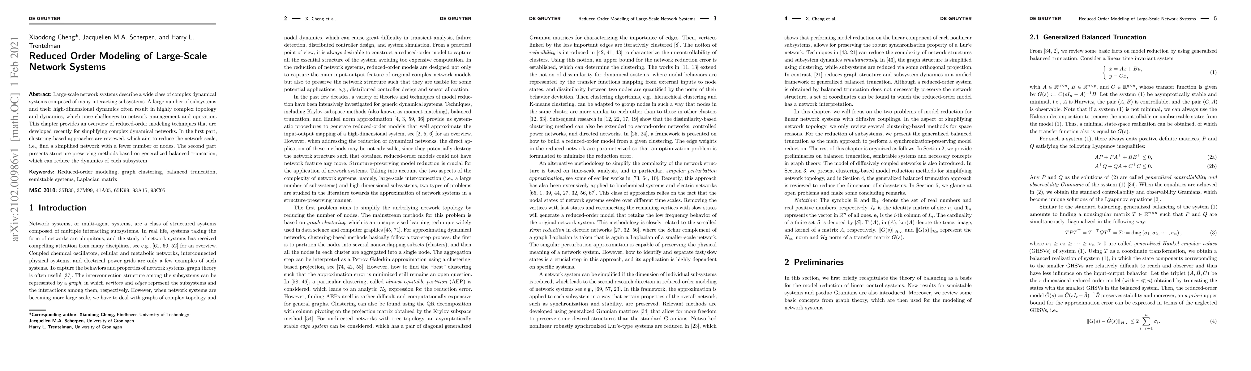 This paper reviews reduced-order modeling techniques for simplifying complex large-scale network systems, focusing on clustering-based approaches to reduce network scale and structure-preserving methods for reducing subsystem dynamics.