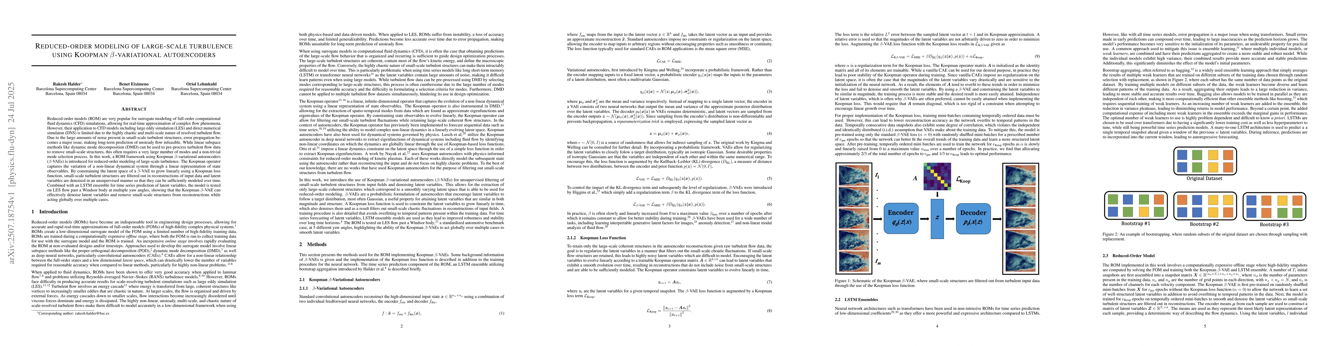 Reduced-order models (ROM) are very popular for surrogate modeling of full-order computational fluid dynamics (CFD) simulations, allowing for real-time approximation of complex flow phenomena. However, their application to CFD models including large eddy simulation (LES) and direct numerical simulaton (DNS) is limited due to the highly chaotic and multi-scale nature of resolved turbulent flow. Due to the large amounts of noise present in small-scale turbulent structures, error propagation becomes a major issue, making long-term prediction of unsteady flow infeasible. While linear subspace methods like dynamic mode decomposition (DMD) can be used to pre-process turbulent flow data to remove small-scale structures, this often requires a very large number of modes and a non-trivial mode selection process. In this work, a ROM framework using Koopman $\beta$-variational autoencoders ($\beta$-VAEs) is introduced for reduced-order modeling of large-scale turbulence. The Koopman operator captures the variation of a non-linear dynamical system through a linear representation of state observables. By constraining the latent space of a $\beta$-VAE to grow linearly using a Koopman loss function, small-scale turbulent structures are filtered out in reconstructions of input data and latent variables are denoised in an unsupervised manner so that they can be sufficiently modeled over time. Combined with an LSTM ensemble for time series prediction of latent variables, the model is tested on LES flow past a Windsor body at multiple yaw angles, showing that the Koopman $\beta$-VAE can effectively denoise latent variables and remove small-scale structures from reconstructions while acting globally over multiple cases.