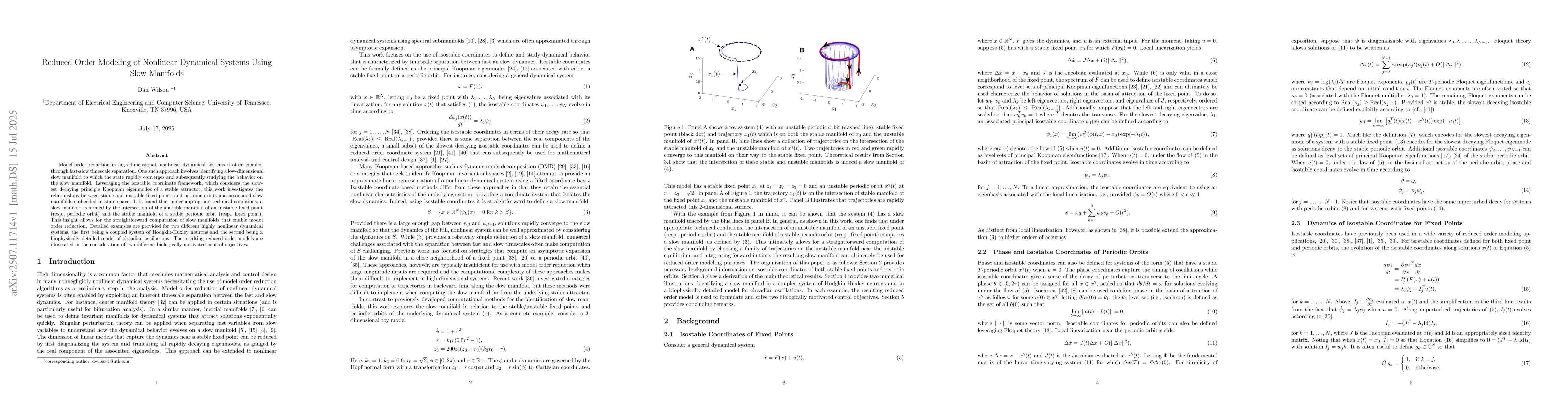 Model order reduction in high-dimensional, nonlinear dynamical systems if often enabled through fast-slow timescale separation. One such approach involves identifying a low-dimensional slow manifold to which the state rapidly converges and subsequently studying the behavior on the slow manifold. Leveraging the isostable coordinate framework, which considers the slowest decaying principle Koopman eigenmodes of a stable attractor, this work investigates the relationships between stable and unstable fixed points and periodic orbits and associated slow manifolds embedded in state space. It is found that under appropriate technical conditions, a slow manifold is formed by the intersection of the unstable manifold of an unstable fixed point (resp.,~periodic orbit) and the stable manifold of a stable periodic orbit (resp.,~fixed point). This insight allows for the straightforward computation of slow manifolds that enable model order reduction. Detailed examples are provided for two different highly nonlinear dynamical systems, the first being a coupled system of Hodgkin-Huxley neurons and the second being a biophysically detailed model of circadian oscillations. The resulting reduced order models are illustrated in the consideration of two different biologically motivated control objectives.