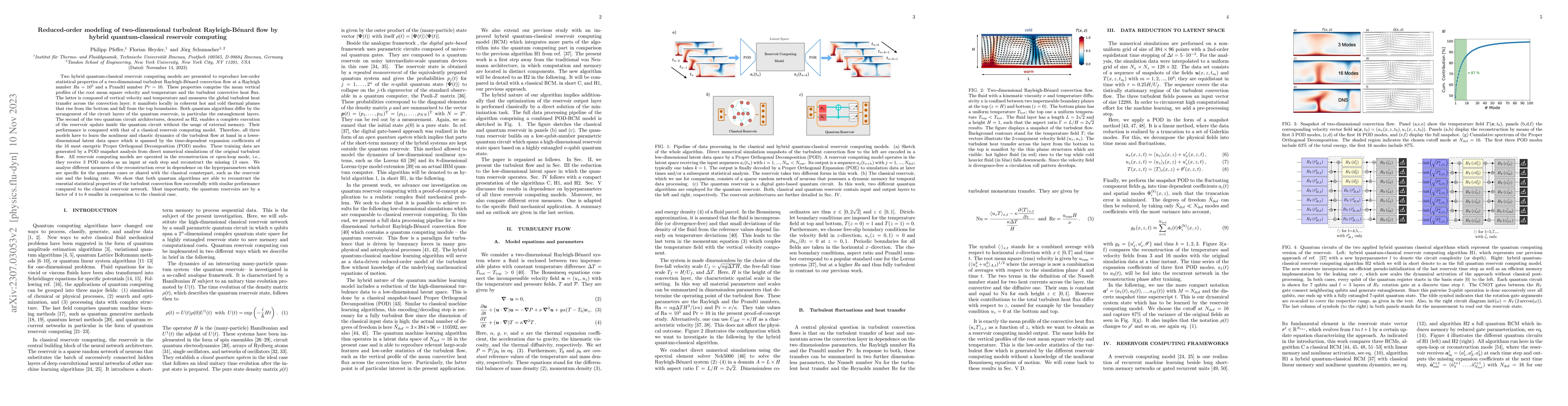 This paper presents two hybrid quantum-classical reservoir computing models to reproduce statistical properties of turbulent Rayleigh-Bénard convection. Both quantum models outperform the classical model in terms of reservoir size, with similar reconstruction accuracy, demonstrating the potential of quantum computing in fluid dynamics simulations.