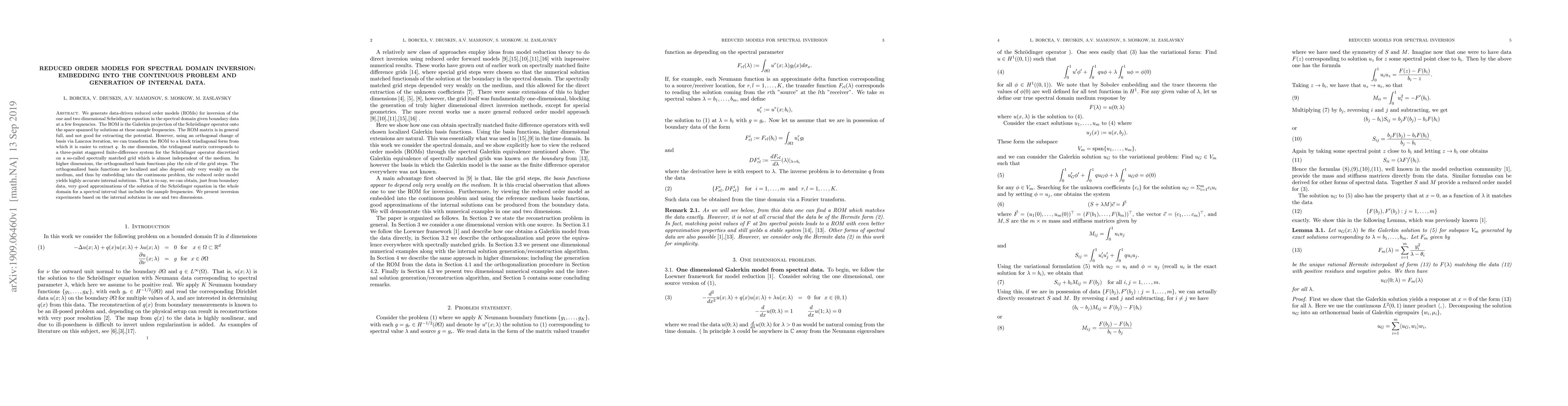 We generate data-driven reduced order models (ROMs) for inversion of the one and two dimensional Schr\"odinger equation in the spectral domain given boundary data at a few frequencies. The ROM is the Galerkin projection of the Schr\"odinger operator onto the space spanned by solutions at these sample frequencies. The ROM matrix is in general full, and not good for extracting the potential. However, using an orthogonal change of basis via Lanczos iteration, we can transform the ROM to a block triadiagonal form from which it is easier to extract $q$. In one dimension, the tridiagonal matrix corresponds to a three-point staggered finite-difference system for the Schr\"odinger operator discretized on a so-called spectrally matched grid which is almost independent of the medium. In higher dimensions, the orthogonalized basis functions play the role of the grid steps. The orthogonalized basis functions are localized and also depend only very weakly on the medium, and thus by embedding into the continuous problem, the reduced order model yields highly accurate internal solutions. That is to say, we can obtain, just from boundary data, very good approximations of the solution of the Schr\"odinger equation in the whole domain for a spectral interval that includes the sample frequencies. We present inversion experiments based on the internal solutions in one and two dimensions.