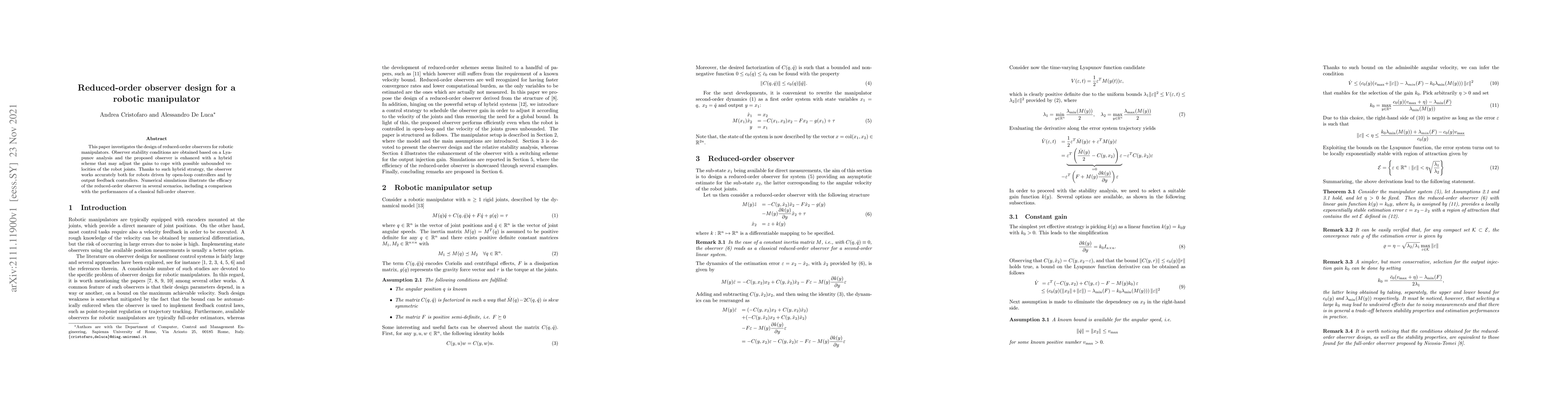 Researchers designed a reduced-order observer for robotic manipulators to improve performance with hybrid gain adjustment, achieving stable results in various scenarios.
