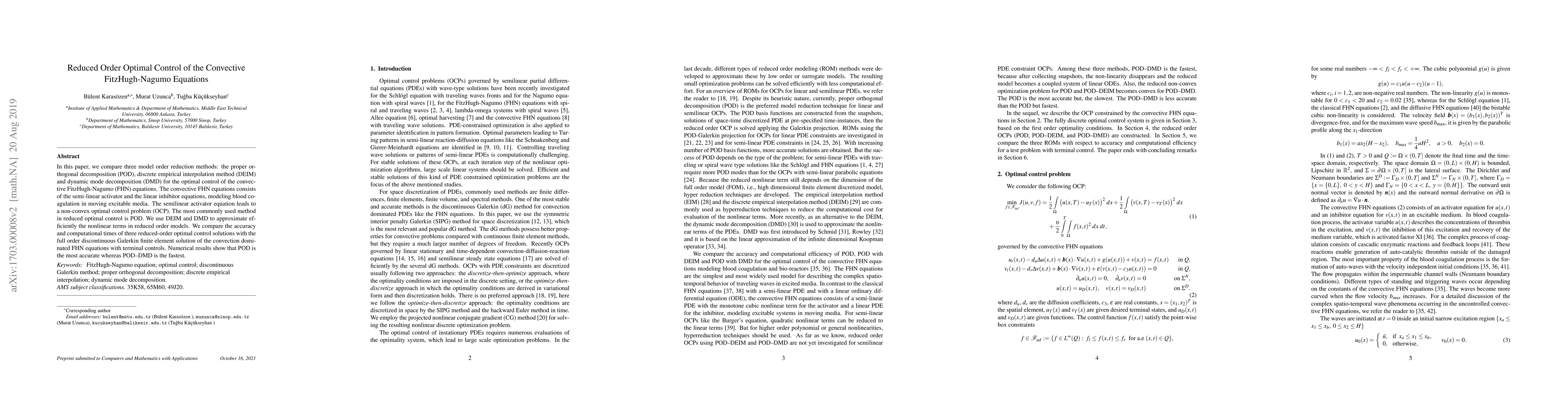In this paper, we compare three model order reduction methods: the proper orthogonal decomposition (POD), discrete empirical interpolation method (DEIM) and dynamic mode decomposition (DMD) for the optimal control of the convective FitzHugh-Nagumo (FHN) equations. The convective FHN equations consists of the semi-linear activator and the linear inhibitor equations, modeling blood coagulation in moving excitable media. The semilinear activator equation leads to a non-convex optimal control problem (OCP). The most commonly used method in reduced optimal control is POD. We use DEIM and DMD to approximate efficiently the nonlinear terms in reduced order models. We compare the accuracy and computational times of three reduced-order optimal control solutions with the full order discontinuous Galerkin finite element solution of the convection dominated FHN equations with terminal controls. Numerical results show that POD is the most accurate whereas POD-DMD is the fastest.