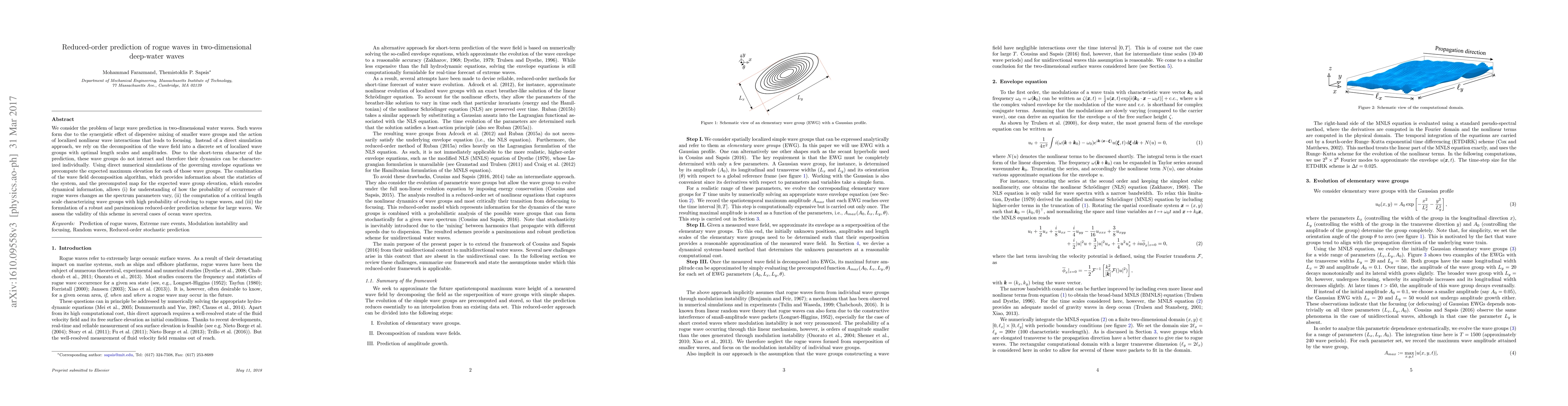 We consider the problem of large wave prediction in two-dimensional water waves. Such waves form due to the synergistic effect of dispersive mixing of smaller wave groups and the action of localized nonlinear wave interactions that leads to focusing. Instead of a direct simulation approach, we rely on the decomposition of the wave field into a discrete set of localized wave groups with optimal length scales and amplitudes. Due to the short-term character of the prediction, these wave groups do not interact and therefore their dynamics can be characterized individually. Using direct numerical simulations of the governing envelope equations we precompute the expected maximum elevation for each of those wave groups. The combination of the wave field decomposition algorithm, which provides information about the statistics of the system, and the precomputed map for the expected wave group elevation, which encodes dynamical information, allows (i) for understanding of how the probability of occurrence of rogue waves changes as the spectrum parameters vary, (ii) the computation of a critical length scale characterizing wave groups with high probability of evolving to rogue waves, and (iii) the formulation of a robust and parsimonious reduced-order prediction scheme for large waves. We assess the validity of this scheme in several cases of ocean wave spectra.