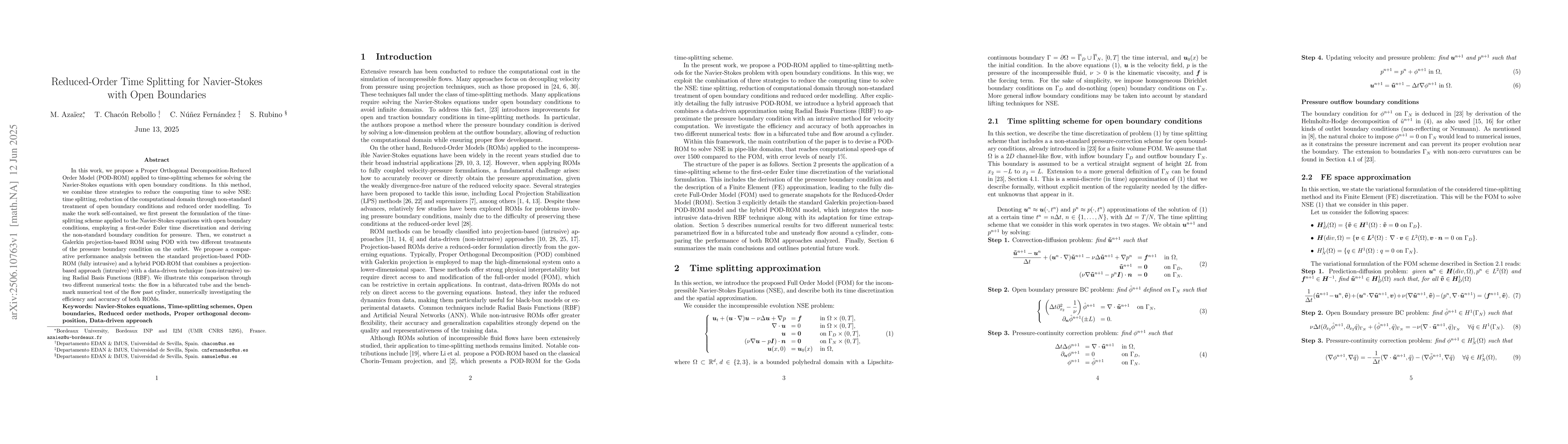 In this work, we propose a Proper Orthogonal Decomposition-Reduced Order Model (POD-ROM) applied to time-splitting schemes for solving the Navier-Stokes equations with open boundary conditions. In this method, we combine three strategies to reduce the computing time to solve NSE: time splitting, reduction of the computational domain through non-standard treatment of open boundary conditions and reduced order modelling. To make the work self-contained, we first present the formulation of the time-splitting scheme applied to the Navier-Stokes equations with open boundary conditions, employing a first-order Euler time discretization and deriving the non-standard boundary condition for pressure. Then, we construct a Galerkin projection-based ROM using POD with two different treatments of the pressure boundary condition on the outlet. We propose a comparative performance analysis between the standard projection-based POD-ROM (fully intrusive) and a hybrid POD-ROM that combines a projection-based approach (intrusive) with a data-driven technique (non-intrusive) using Radial Basis Functions (RBF). We illustrate this comparison through two different numerical tests: the flow in a bifurcated tube and the benchmark numerical test of the flow past cylinder, numerically investigating the efficiency and accuracy of both ROMs.