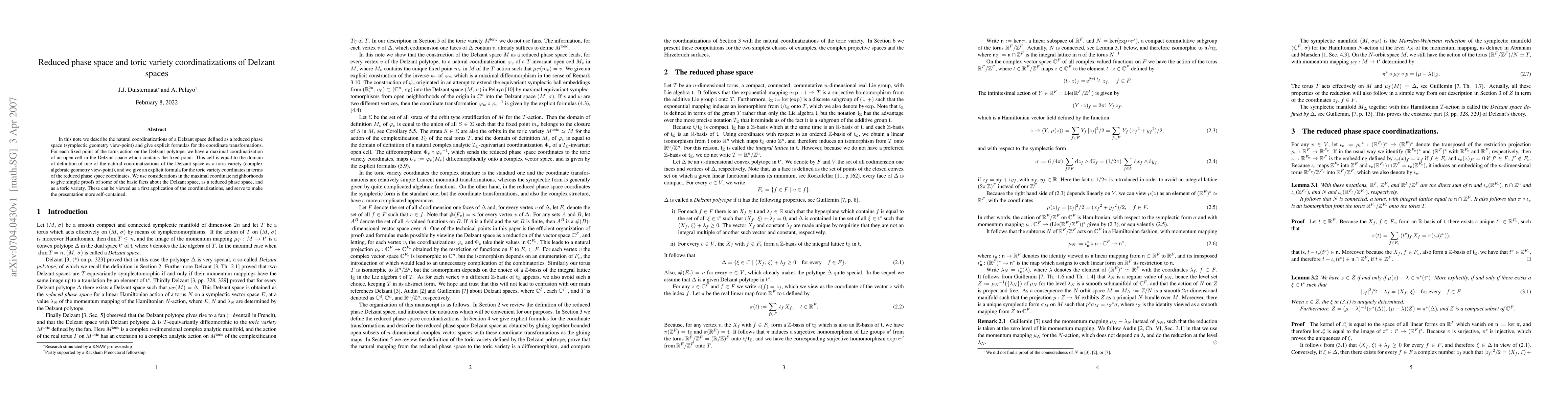 In this note we describe the natural coordinatizations of a Delzant space defined as a reduced phase space (symplectic geometry view-point) and give explicit formulas for the coordinate transformations. For each fixed point of the torus action on the Delzant polytope, we have a maximal coordinatization of an open cell in the Delzant space which contains the fixed point. This cell is equal to the domain of definition of one of the natural coordinatizations of the Delzant space as a toric variety (complex algebraic geometry view-point), and we give an explicit formula for the toric variety coordinates in terms of the reduced phase space coordinates. We use considerations in the maximal coordinate neighborhoods to give simple proofs of some of the basic facts about the Delzant space, as a reduced phase space, and as a toric variety. These can be viewed as a first application of the coordinatizations, and serve to make the presentation more self-contained.