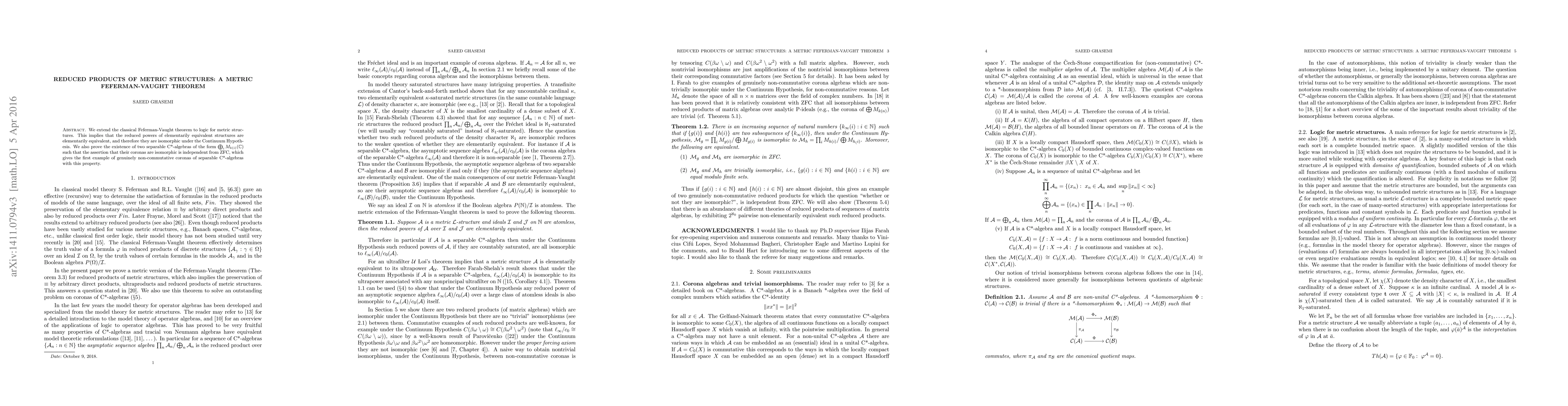 This paper extends the Feferman-Vaught theorem to metric logic, showing that reduced powers of elementarily equivalent metric structures are isomorphic under the Continuum Hypothesis. It also presents the first example of non-commutative coronas of separable C*-algebras whose isomorphism is independent from ZFC.