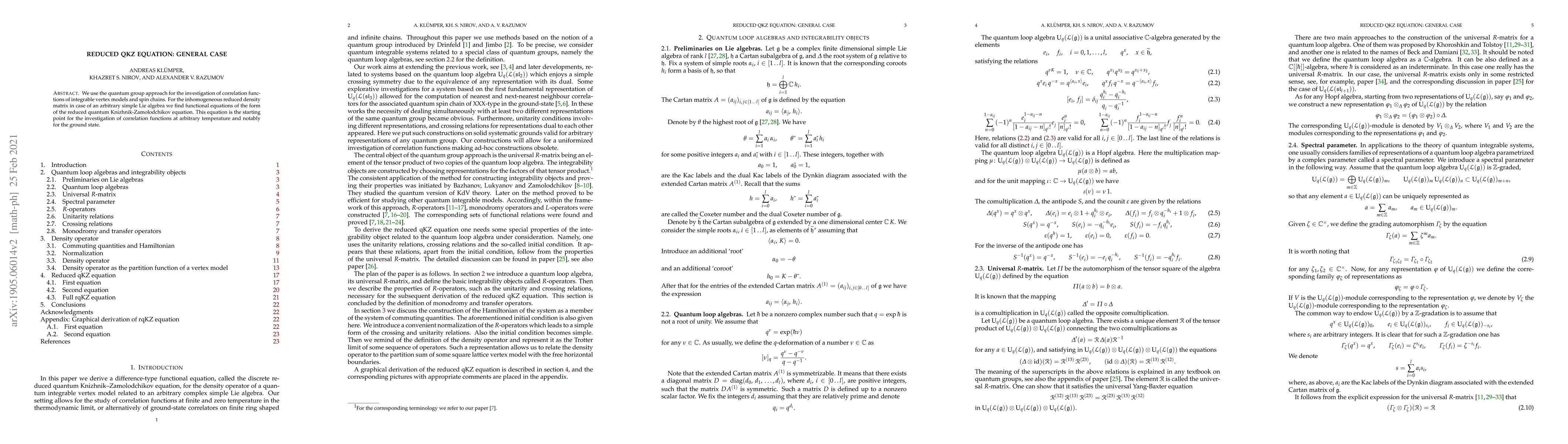 We use the quantum group approach for the investigation of correlation functions of integrable vertex models and spin chains. For the inhomogeneous reduced density matrix in case of an arbitrary simple Lie algebra we find functional equations of the form of the reduced quantum Knizhnik-Zamolodchikov equation. This equation is the starting point for the investigation of correlation functions at arbitrary temperature and notably for the ground state.
