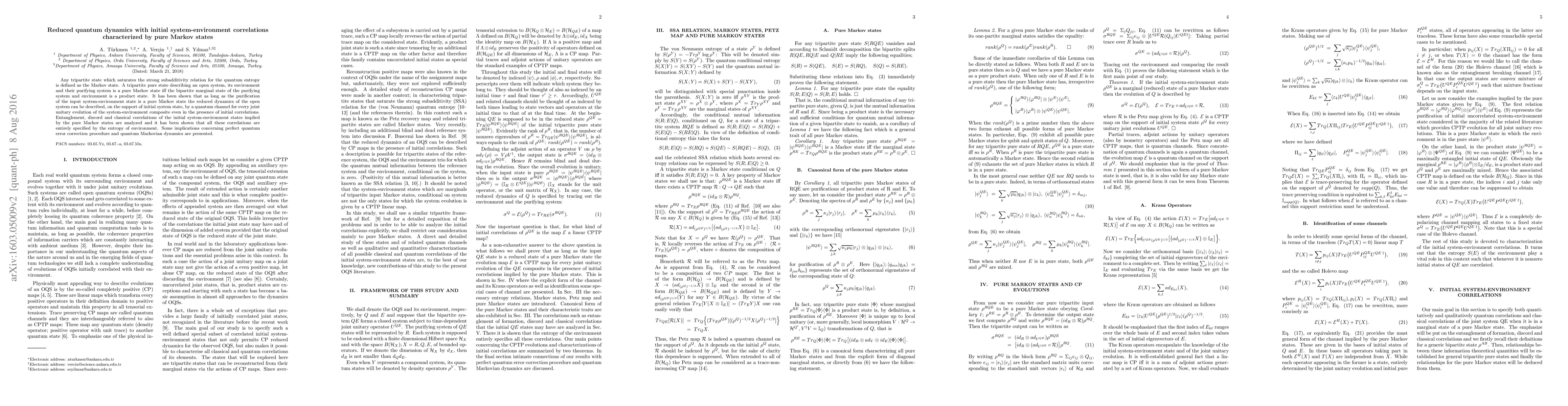 This paper investigates pure Markov states in tripartite quantum systems, showing that if the initial state is a pure Markov state, the reduced dynamics of the system can be described by a quantum channel, regardless of the joint unitary evolution, even in the presence of initial correlations. The study reveals that entanglement, discord, and classical correlations are fully determined by the entropy of the environment.