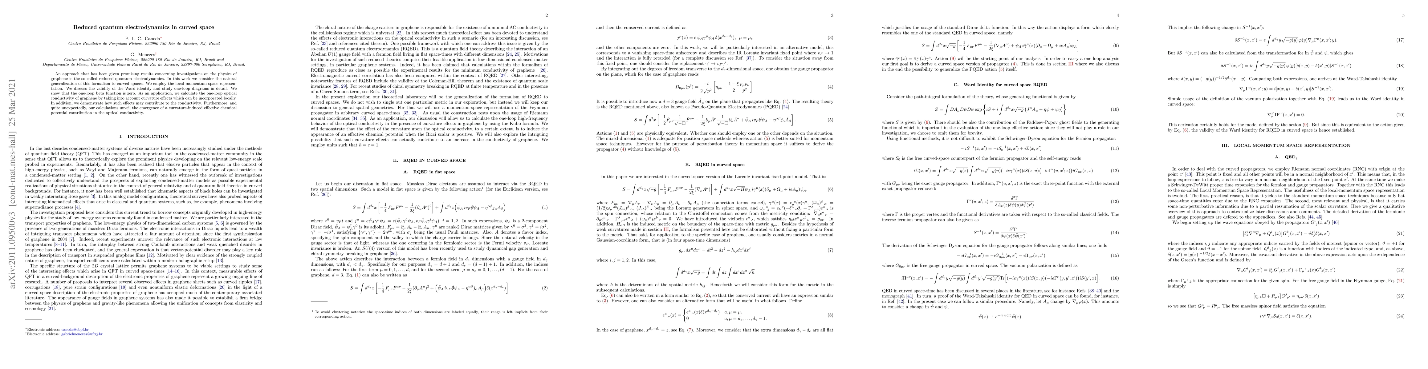 This paper generalizes reduced quantum electrodynamics to curved space, finding that the one-loop beta function is zero. It calculates the one-loop optical conductivity of graphene, revealing curvature effects that contribute to conductivity and unexpectedly uncovering a curvature-induced effective chemical potential.