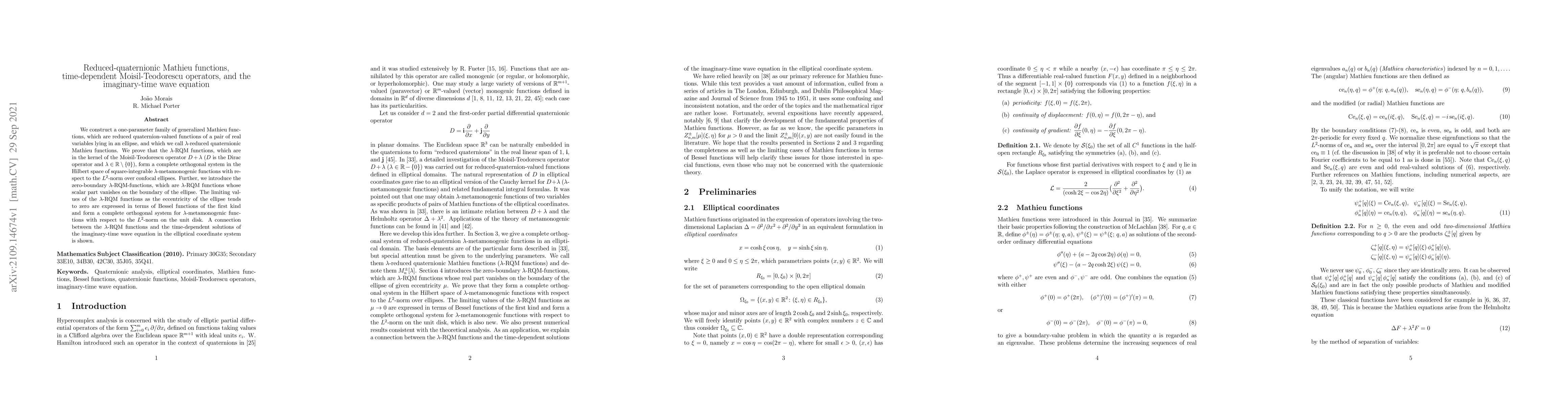 Researchers develop a new type of mathematical function called lambda-reduced quaternionic Mathieu functions, which are used to solve the imaginary-time wave equation in an elliptical coordinate system.