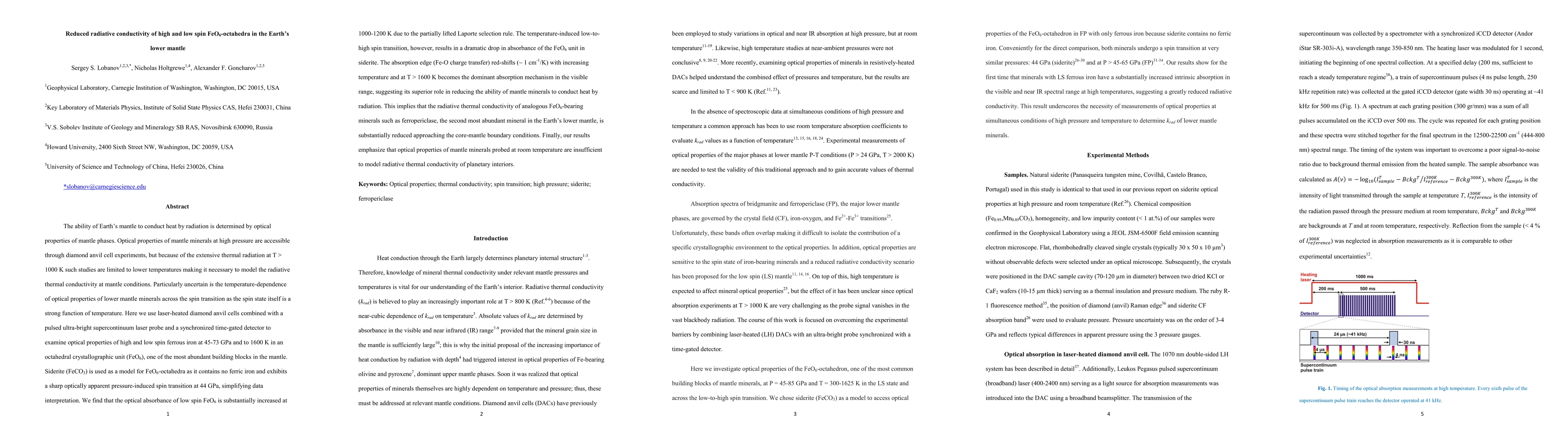 The ability of Earths mantle to conduct heat by radiation is determined by optical properties of mantle phases. Optical properties of mantle minerals at high pressure are accessible through diamond anvil cell experiments, but because of the extensive thermal radiation at T above 1000 K such studies are limited to lower temperatures. Particularly uncertain is the temperature-dependence of optical properties of lower mantle minerals across the spin transition as the spin state itself is a strong function of temperature. Here we use laser-heated DACs combined with a pulsed bright supercontinuum laser probe and a synchronized time-gated detector to examine optical properties of high and low spin ferrous iron at 45-73 GPa and to 1600 K in FeO6, one of the most abundant building blocks in the mantle. Siderite (FeCO3) is used as a model for FeO6-octahedra as it contains no ferric iron and exhibits a sharp optically apparent spin transition at 44 GPa, simplifying data interpretation. We find that the optical absorbance of low spin FeO6 is substantially increased at 1000-1200 K due to the partially lifted Laporte selection rule. The temperature-induced low to high spin transition, however, results in a dramatic drop in absorbance of the FeO6-unit. The absorption edge (Fe-O charge transfer) red-shifts (~ 1 cm-1/K) with increasing temperature and at T above 1600 K becomes the dominant absorption mechanism in the visible range, suppressing radiative conductivity. This implies that the radiative conductivity of analogous FeO6-bearing minerals such as ferropericlase, the second most abundant mineral in the Earths lower mantle, is substantially reduced approaching the core-mantle boundary conditions. Finally, our results emphasize that optical properties of mantle minerals probed at room temperature are insufficient to model radiative thermal conductivity of planetary interiors.