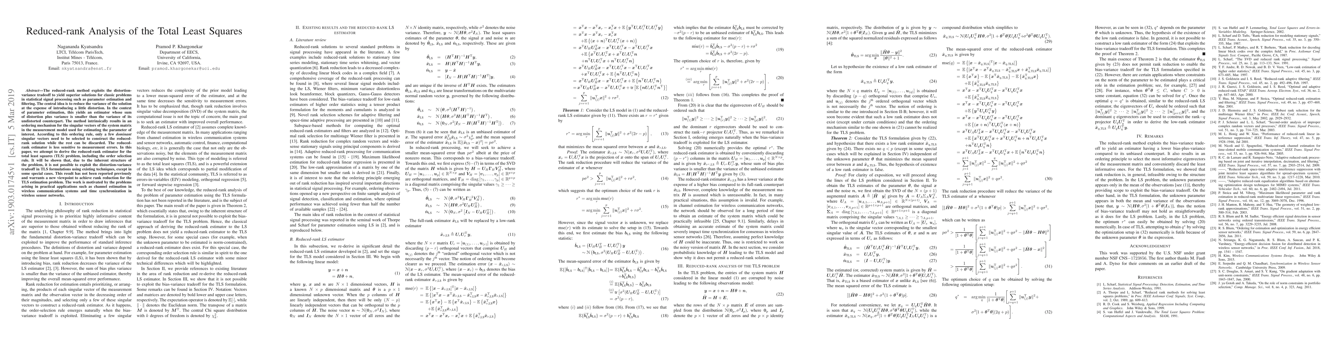 The reduced-rank method exploits the distortion-variance tradeoff to yield superior solutions for classic problems in statistical signal processing such as parameter estimation and filtering. The central idea is to reduce the variance of the solution at the expense of introducing a little distortion. In the context of parameter estimation, this yields an estimator whose sum of distortion plus variance is smaller than the variance of its undistorted counterpart. The method intrinsically results in an ordering mechanism for the singular vectors of the system matrix in the measurement model used for estimating the parameter of interest. According to this ordering rule, only a few \emph{dominant} singular vectors need to be selected to construct the reduced-rank solution while the rest can be discarded. The reduced-rank estimator is less sensitive to measurement errors. In this paper, we attempt to derive the reduced-rank estimator for the total least squares (TLS) problem, including the order selection rule. It will be shown that, due to the inherent structure of the problem, it is not possible to exploit the distortion-variance tradeoff in TLS formulations using existing techniques, except in some special cases. This result has not been reported previously and warrants a new viewpoint to achieve rank reduction for the TLS estimation problem. The work is motivated by the problems arising in practical applications such as channel estimation in wireless communication systems and time synchronization in wireless sensor networks.