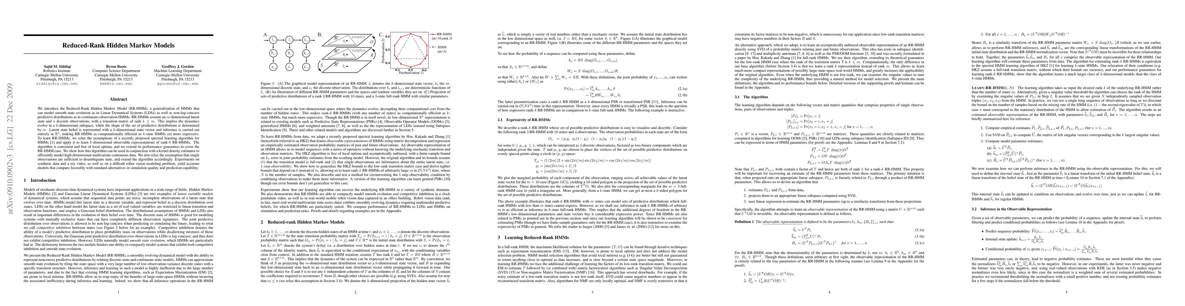 We introduce the Reduced-Rank Hidden Markov Model (RR-HMM), a generalization of HMMs that can model smooth state evolution as in Linear Dynamical Systems (LDSs) as well as non-log-concave predictive distributions as in continuous-observation HMMs. RR-HMMs assume an m-dimensional latent state and n discrete observations, with a transition matrix of rank k <= m. This implies the dynamics evolve in a k-dimensional subspace, while the shape of the set of predictive distributions is determined by m. Latent state belief is represented with a k-dimensional state vector and inference is carried out entirely in R^k, making RR-HMMs as computationally efficient as k-state HMMs yet more expressive. To learn RR-HMMs, we relax the assumptions of a recently proposed spectral learning algorithm for HMMs (Hsu, Kakade and Zhang 2009) and apply it to learn k-dimensional observable representations of rank-k RR-HMMs. The algorithm is consistent and free of local optima, and we extend its performance guarantees to cover the RR-HMM case. We show how this algorithm can be used in conjunction with a kernel density estimator to efficiently model high-dimensional multivariate continuous data. We also relax the assumption that single observations are sufficient to disambiguate state, and extend the algorithm accordingly. Experiments on synthetic data and a toy video, as well as on a difficult robot vision modeling problem, yield accurate models that compare favorably with standard alternatives in simulation quality and prediction capability.