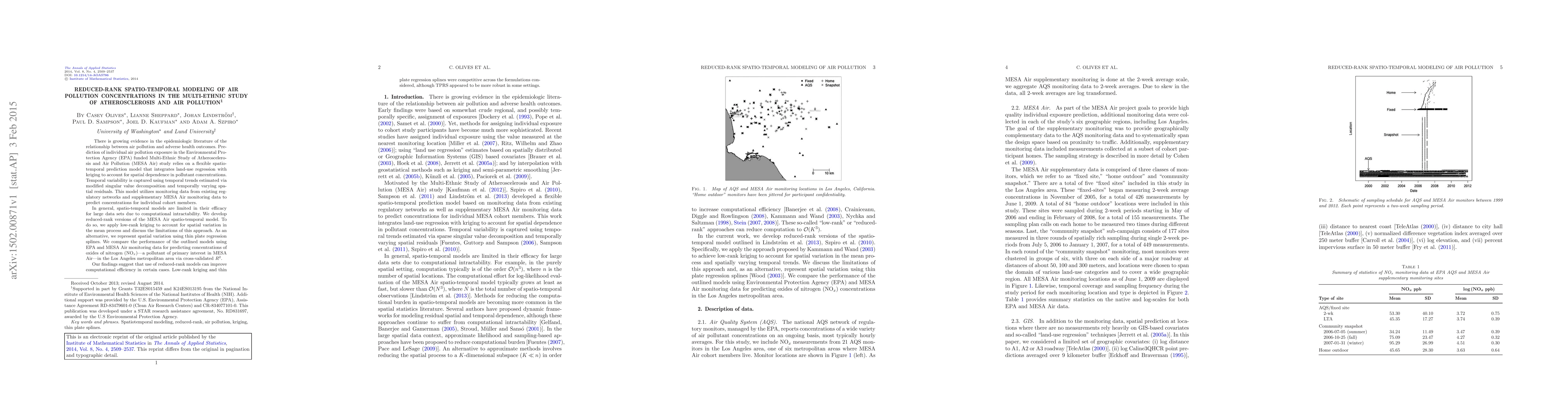This paper develops reduced-rank spatio-temporal models to predict air pollution concentrations in the MESA Air study, using reduced-rank kriging and thin plate regression splines to improve computational efficiency. The models show competitive performance for predicting nitrogen oxides, with thin plate regression splines appearing more robust in certain conditions.