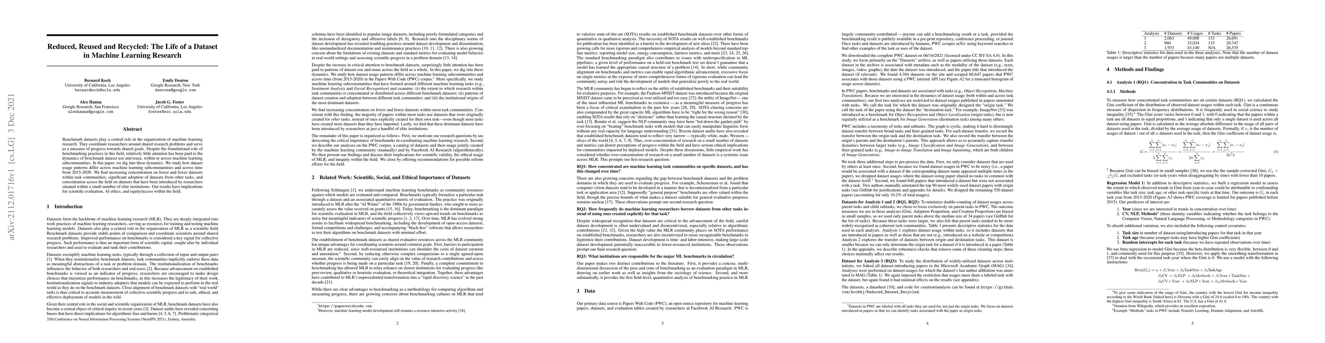 A study analyzes the dynamics of benchmark dataset use in machine learning from 2015-2020, finding concentration on fewer datasets within task communities and adoption of datasets from other tasks.