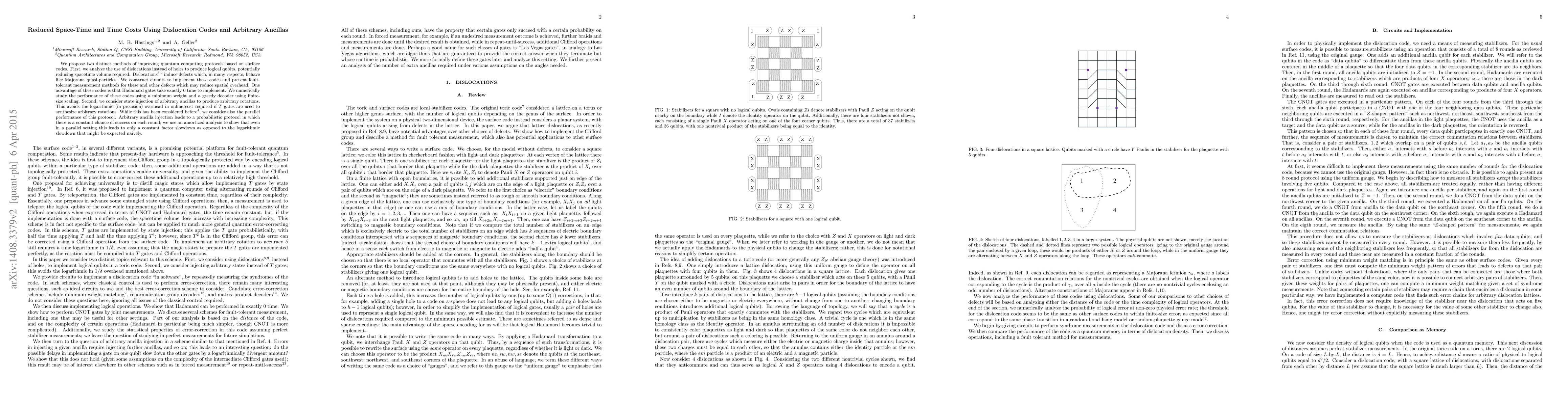 We propose two distinct methods of improving quantum computing protocols based on surface codes. First, we analyze the use of dislocations instead of holes to produce logical qubits, potentially reducing spacetime volume required. Dislocations induce defects which, in many respects, behave like Majorana quasi-particles. We construct circuits to implement these codes and present fault-tolerant measurement methods for these and other defects which may reduce spatial overhead. One advantage of these codes is that Hadamard gates take exactly $0$ time to implement. We numerically study the performance of these codes using a minimum weight and a greedy decoder using finite-size scaling. Second, we consider state injection of arbitrary ancillas to produce arbitrary rotations. This avoids the logarithmic (in precision) overhead in online cost required if $T$ gates are used to synthesize arbitrary rotations. While this has been considered before, we consider also the parallel performance of this protocol. Arbitrary ancilla injection leads to a probabilistic protocol in which there is a constant chance of success on each round; we use an amortized analysis to show that even in a parallel setting this leads to only a constant factor slowdown as opposed to the logarithmic slowdown that might be expected naively.