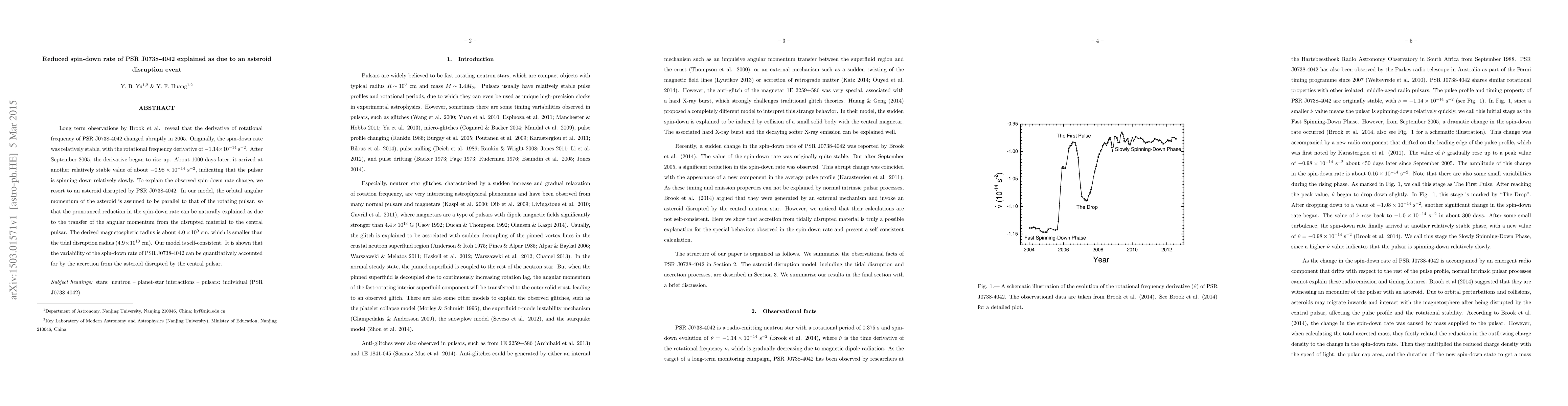 Long term observations by Brook et al. reveal that the derivative of rotational frequency of PSR J0738-4042 changed abruptly in 2005. Originally, the spin-down rate was relatively stable, with the rotational frequency derivative of $-1.14 \times 10^{-14}~\rm s^{-2}$. After September 2005, the derivative began to rise up. About 1000 days later, it arrived at another relatively stable value of about $-0.98 \times 10^{-14}~\rm s^{-2}$, indicating that the pulsar is spinning-down relatively slowly. To explain the observed spin-down rate change, we resort to an asteroid disrupted by PSR J0738-4042. In our model, the orbital angular momentum of the asteroid is assumed to be parallel to that of the rotating pulsar, so that the pronounced reduction in the spin-down rate can be naturally explained as due to the transfer of the angular momentum from the disrupted material to the central pulsar. The derived magnetospheric radius is about $4.0 \times 10^{9}$ cm, which is smaller than the tidal disruption radius ($4.9 \times 10^{10}$ cm). Our model is self-consistent. It is shown that the variability of the spin-down rate of PSR J0738-4042 can be quantitatively accounted for by the accretion from the asteroid disrupted by the central pulsar.