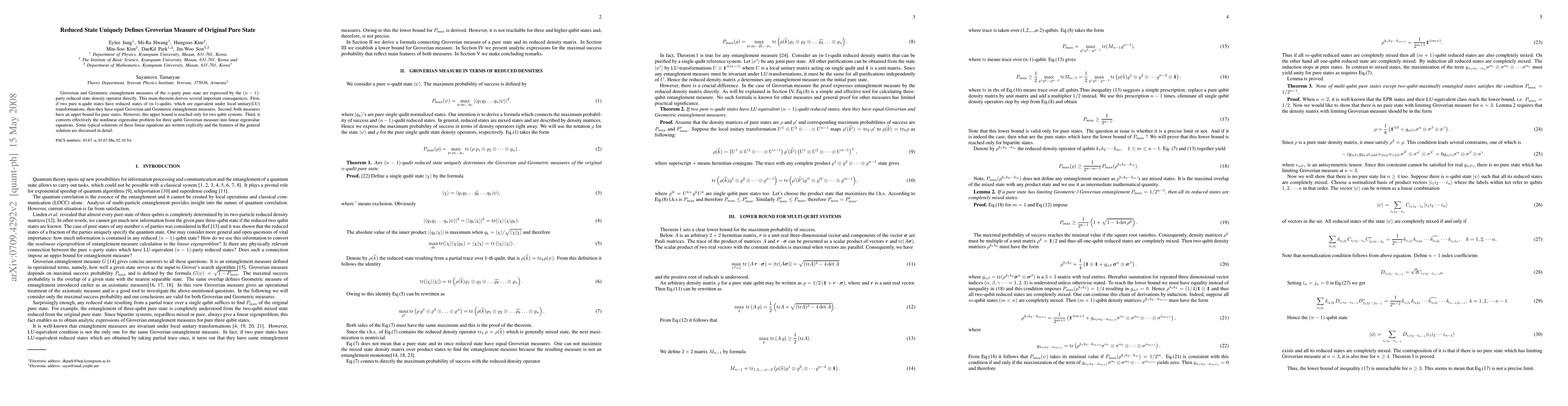 This paper establishes that the Groverian and Geometric entanglement measures of a pure n-party state are directly determined by the (n-1)-party reduced state density operator. It concludes that equivalent reduced states imply equal entanglement measures and highlights that the upper bound for these measures is only achieved for two-qubit systems.